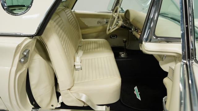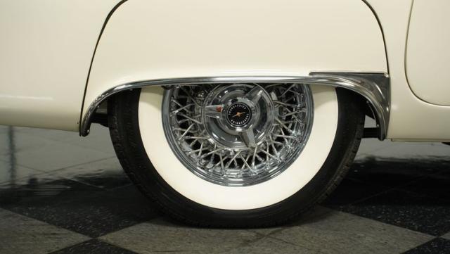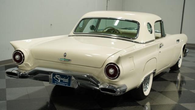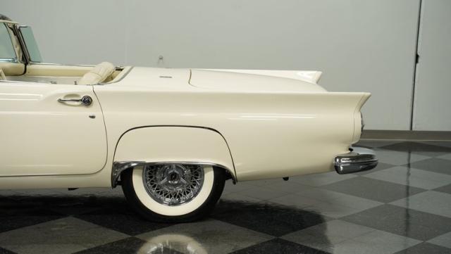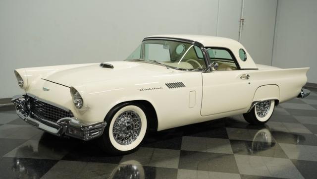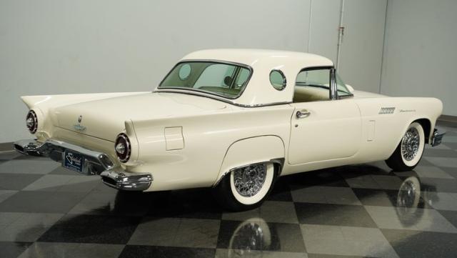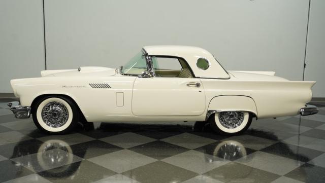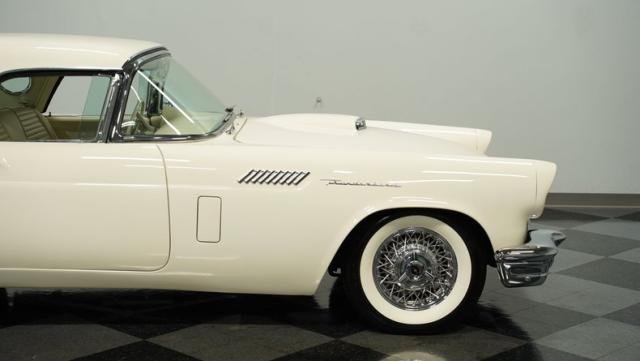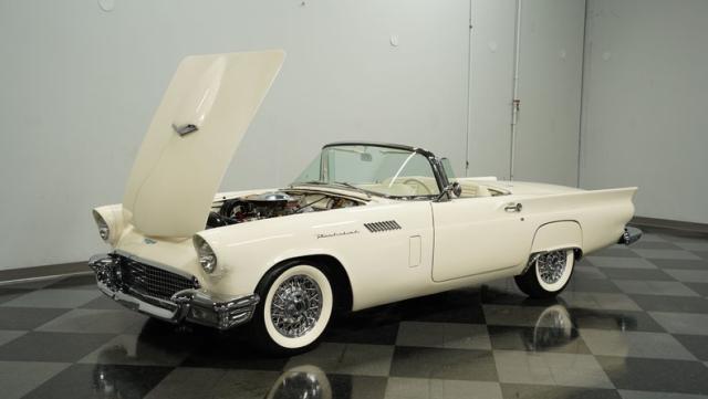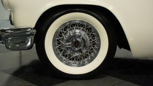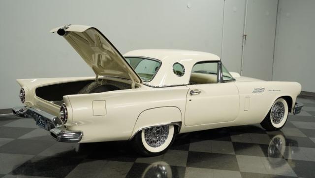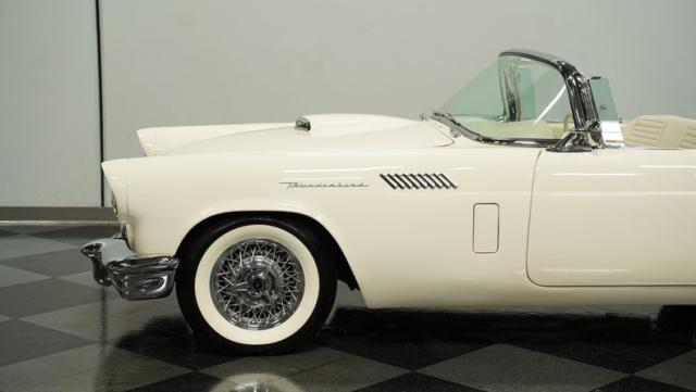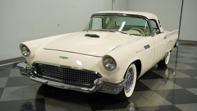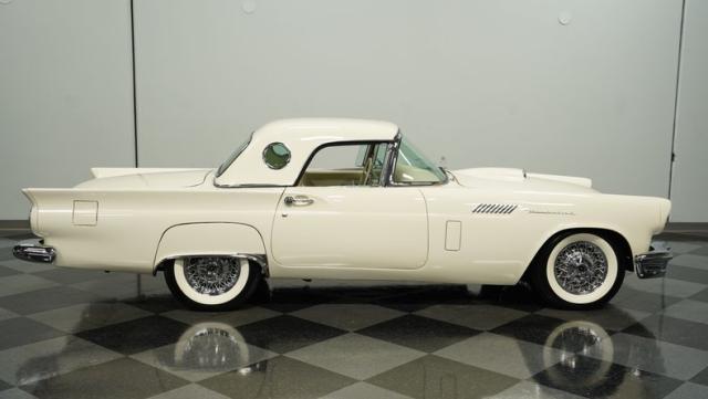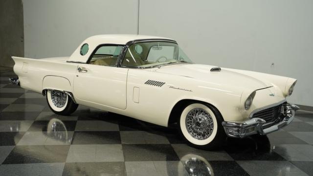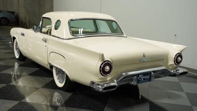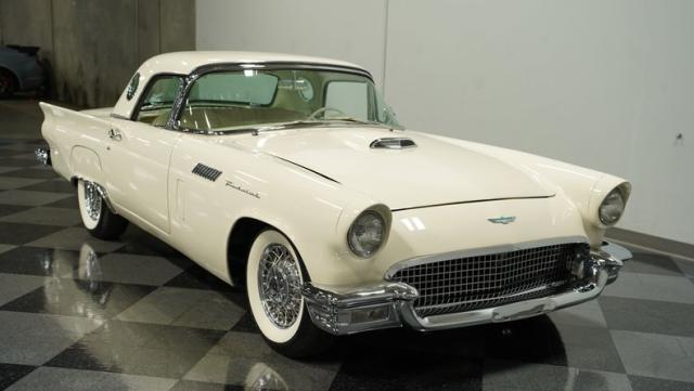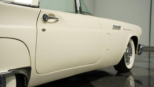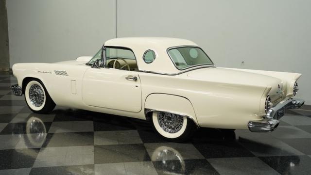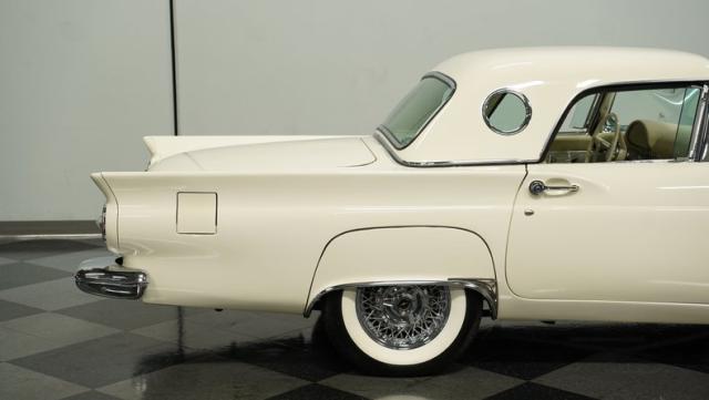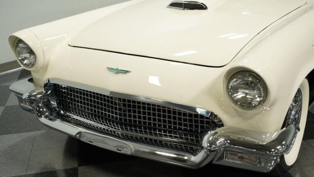 Dressed in elegant Colonial White, this 1957 Ford Thunderbird gleams as a quintessential icon of sophistication and style. This triple-white marvel is accentuated by chrome wire wheels, whitewall tires, and an instantly recognizable matching removable hardtop, with chrome bumpers and trim that shimmer against the backdrop of its immaculately repainted body. The Thunderbird\'s silhouette, marked by tight gaps and a straight posture, is complemented by a black convertible soft top, enhancing its distinguished appearance.