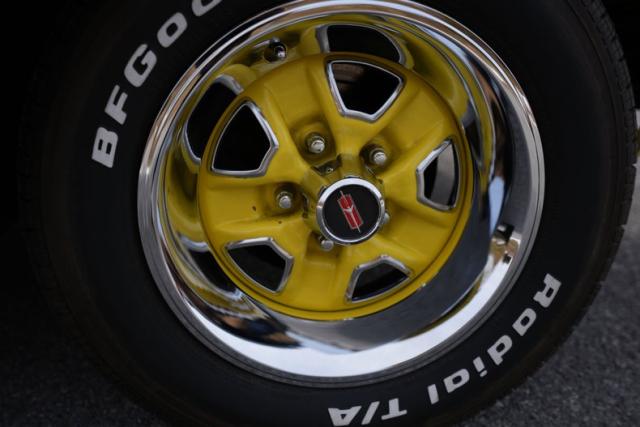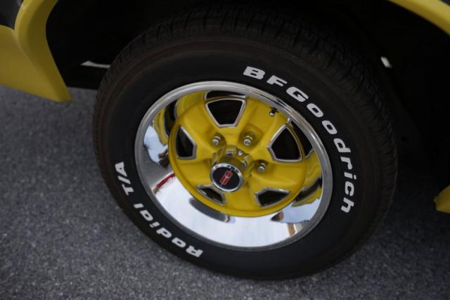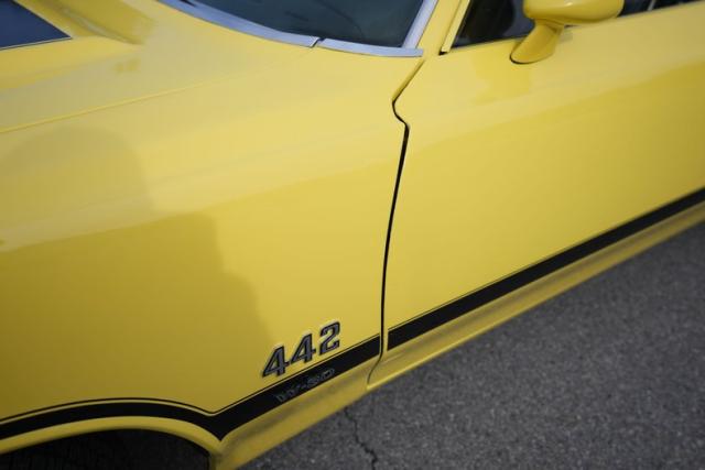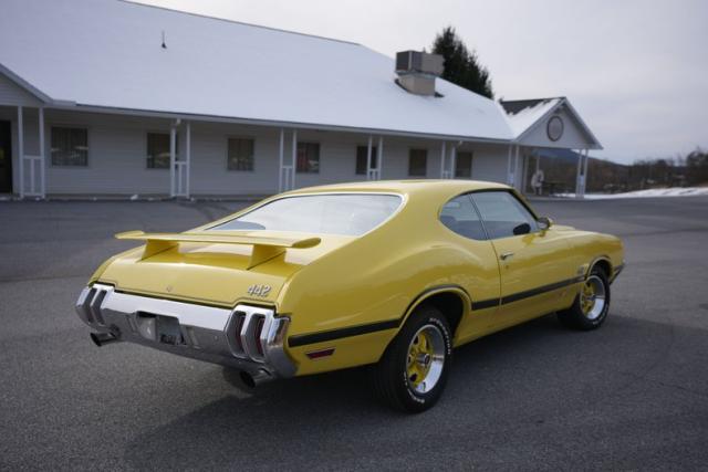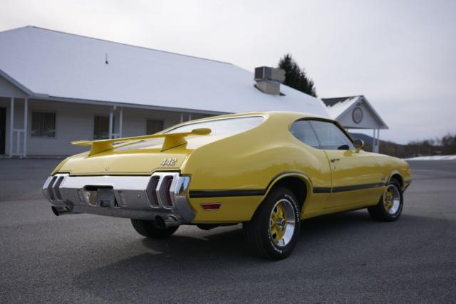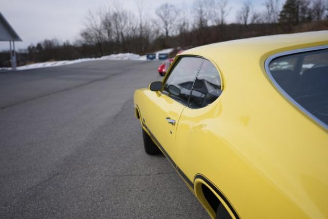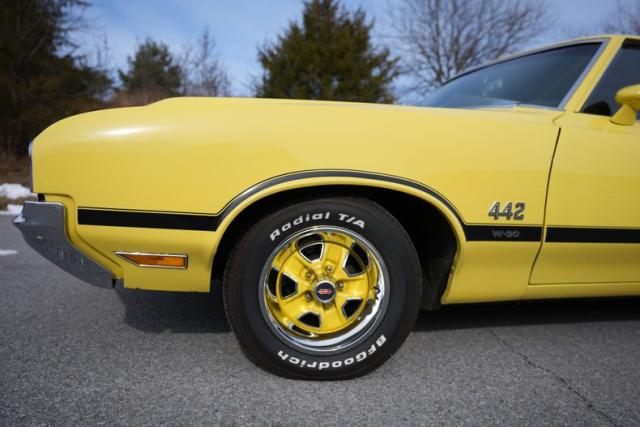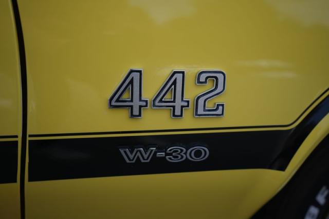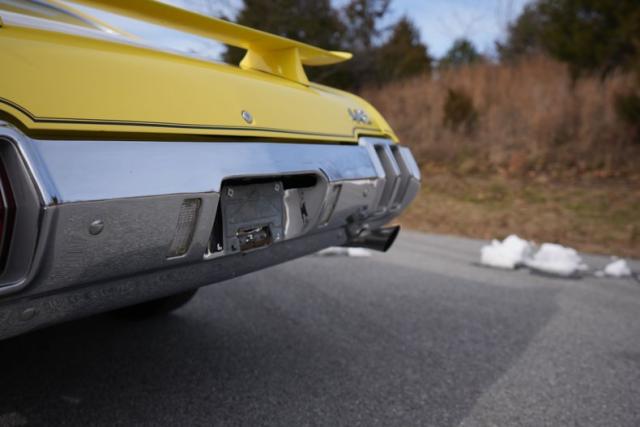 The body is finished in bright yellow with excellent shine and clean panel lines. The air-induction hood and pin locks add period-correct muscle flair, while the rear spoiler and trumpet-style dual exhaust complete the 442-tribute aesthetic. The yellow-coded steel wheels with trim rings and caps tie the look together, delivering a standout stance on the road or at shows.