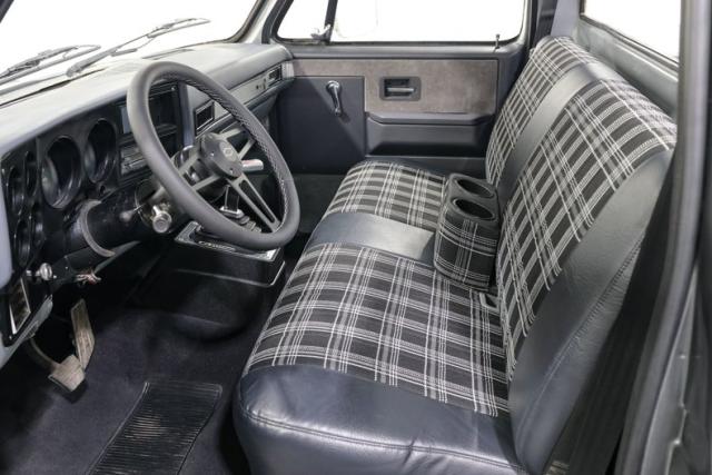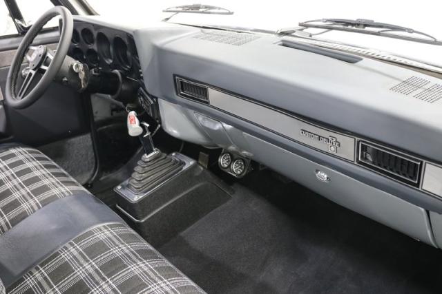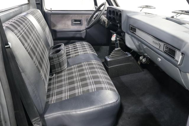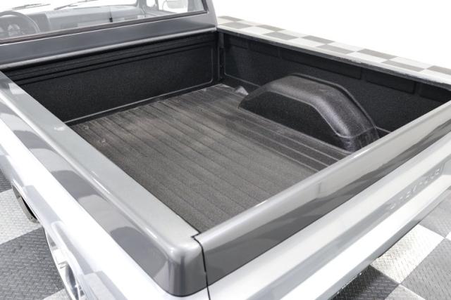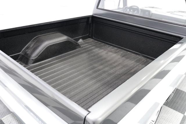 Inside, the gray interior keeps things straightforward and functional with a custom bench seat trimmed in vinyl and cloth, complete with integrated cupholders. A B&M shifter, aftermarket stereo, and spray-in bedliner round out a build that respects the truck\'s roots while delivering the kind of upgrades enthusiasts want.