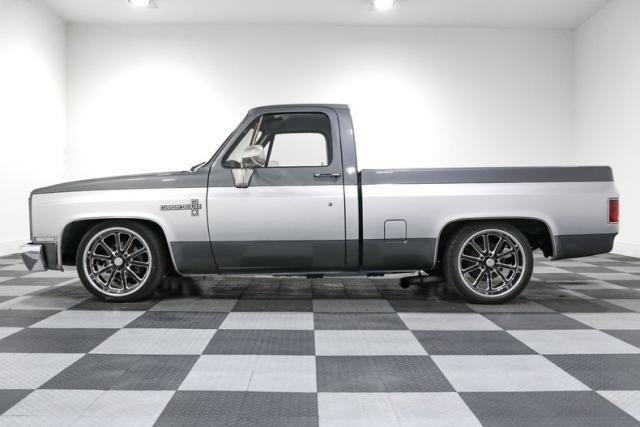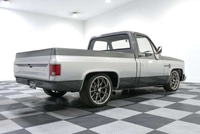 The exterior wears a sharp two tone Silver and Charcoal finish that highlights the C10\'s iconic slab sides and squared-off stance. A rear roll pan cleans up the tail, while 20 inch US Mags wheels give the truck a planted, aggressive look that bridges classic style with modern muscle.