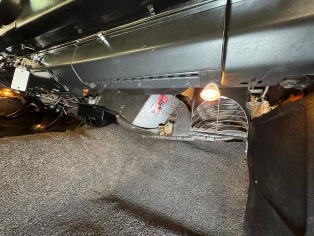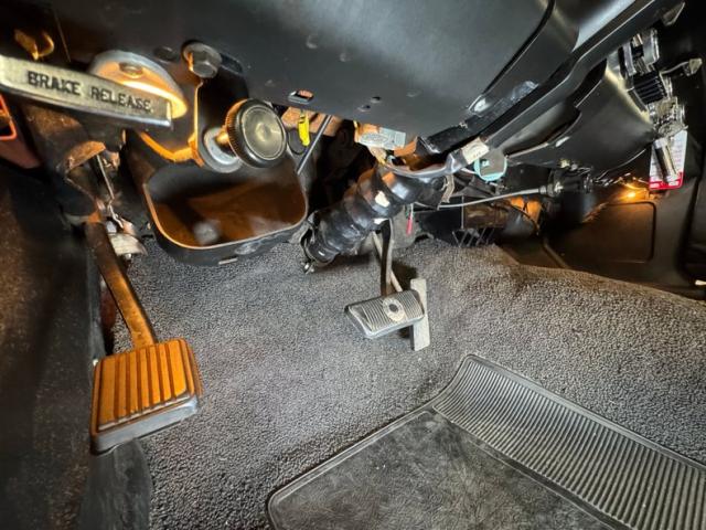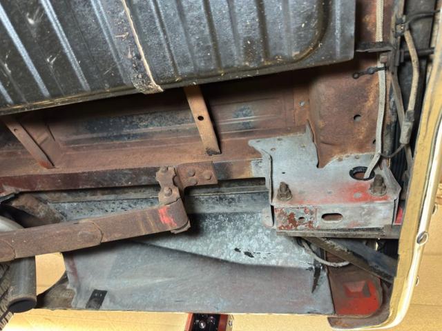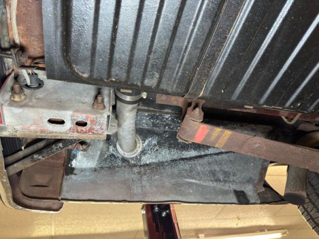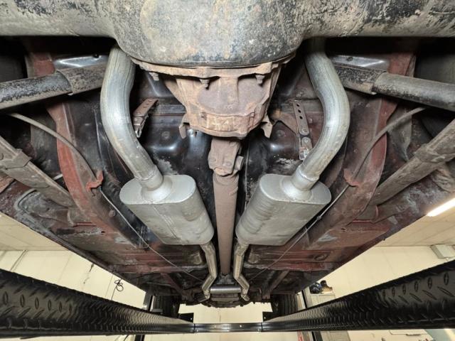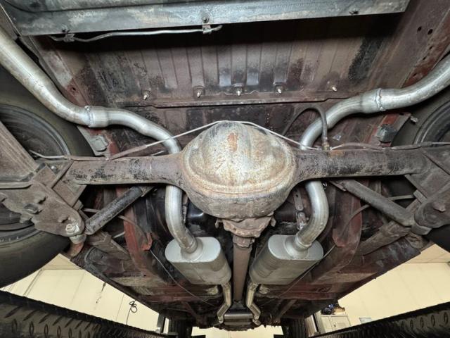 Driver quality conditions are found underneath with a mix of surface rust, red oxide primer, general oxidation and patina and mostly dry conditions with a light film of residual oil on the pan. The exhaust looks newer, and the dual system runs back to FlowMaster mufflers before terminating behind body panels after the back wheels. Coil spring suspension is utilized up front with leaf springs in the back. We note the dust cover on the power steering rack is torn.