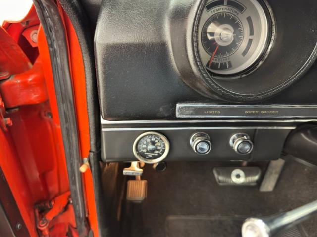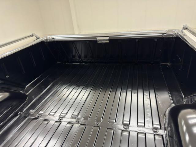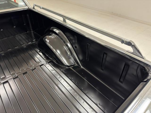 A simulated wood insert on the black vinyl doors puts the luxury in luxury truck, as it was in 1969, and they both present cleanly serving as the entry points to the stylish full width seat in black pleated vinyl with a few tears in the stitched seams, but otherwise clean. The jack and spare are stowed away in the space behind the seat and our black plastic steering wheel ahead has a crack in the rim. A stitch design is molded into the gauge housing on the dash for a bit of a Western flair, while the electric clock in the fourth cove is part of the 500 upgrade. An AM radio is on the mid panel and the open floor is covered cleanly with black loop carpet. While up top, the stitched black headliner and visors are in great shape.