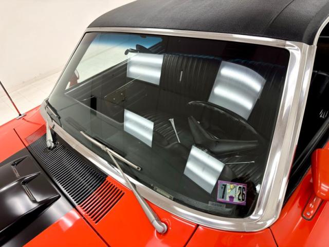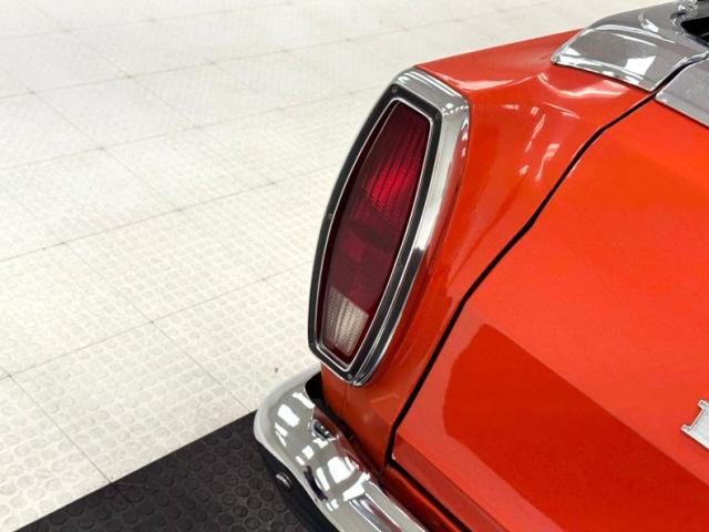 One of three colors offered on the Special Performance Vehicle from Ford, Calypso Coral provides the shine here in two stage application. The hood scoop, which was standard on the GT and added as part of the Rio package, also includes the black center stripe. In profile, other special additions are noted including the side stripes above the rocker panel, the side rails, and the 14-inch Magnum 500 wheels and you can tell this car is a special one from the other side of your ranch property. A black vinyl top accentuates the black and orange palette and tall, vertical tail lights that retain distinctive Ford design. Side molding bisects the profile, Ford\'s widely used dual round headlights lead the way, and the black painted bed is clean. Some bubbling on a quarter panel is the only imperfection we note.