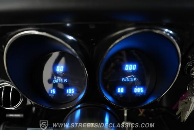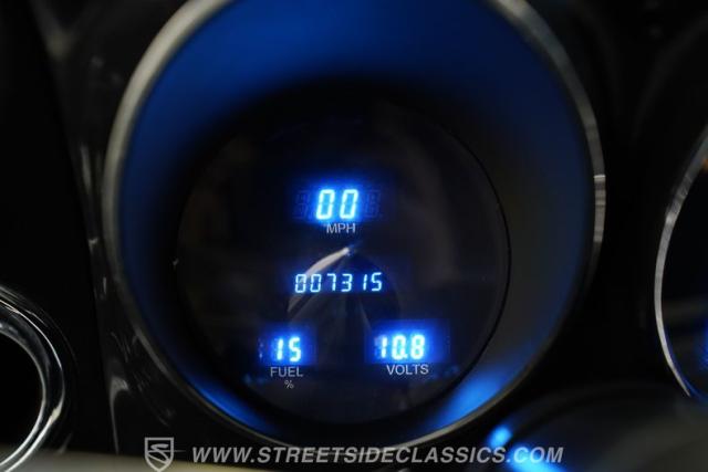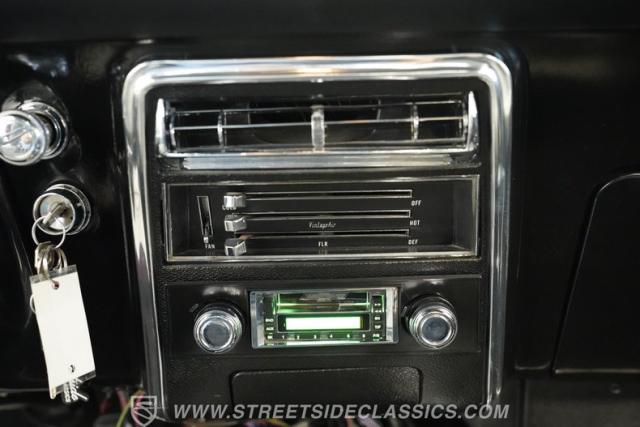 Inside, we find a nicely restored black vinyl interior. An aftermarket center console, complete with dual cupholders separates a pair of bucket seats. A three-spoke power-assisted wheel sits in front of a trick-looking Dakota Digital gauge cluster. Vintage Air HVAC controls and vents provide both heat and air conditioning, while a retro-style AM/FM/Aux/Cassette head unit offers far more soundtrack options than the unit it replaces, making choosing the perfect soundtrack for your road trip that much easier.