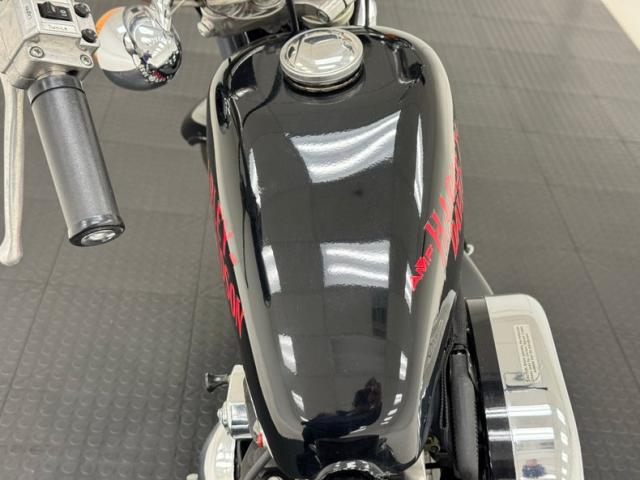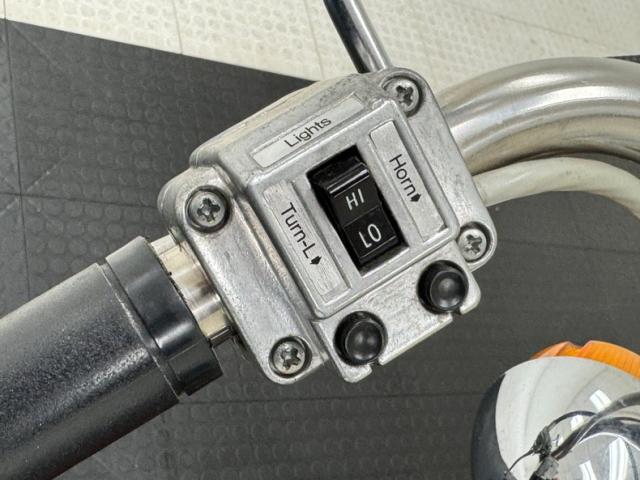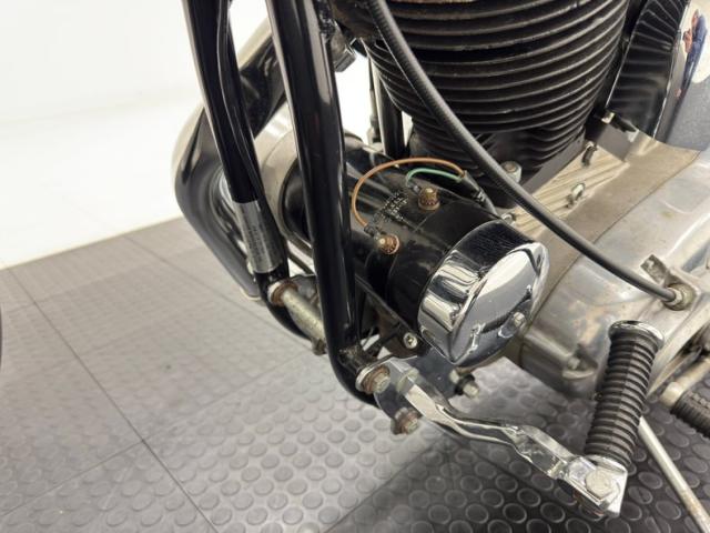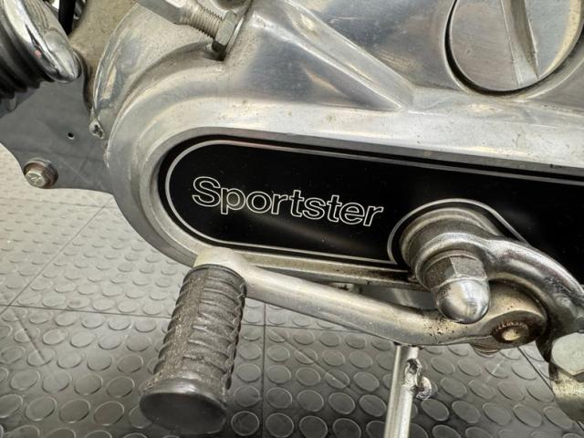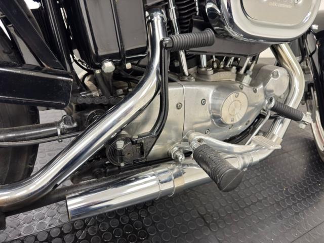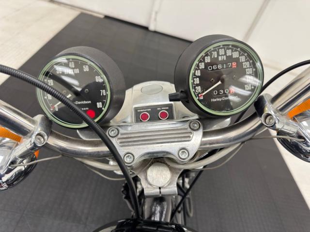 With tall handlebars and a lean frame, the XLCH takes on a distinct profile and is fully dressed in black attire that begins with the gas tank and fenders, continuing with the battery box, darkened fins on the cylinder housing, and frame itself. Call outs included AMF Harley Davidson in some old school font in bright red on the gas tank, the Harley logo on the battery box, and SPEEDSTER broadcast on the gearbox. There\'s plenty of chrome and polished metals to contrast the black including the fork, shock coils, wire wheels, engine covers, and of course, exhaust. It\'s all in very nice condition with only the biscuit tufted black vinyl Cobra seat showing any patina at all, and it\'s minimal. We do note one area of chipping black paint on the frame.