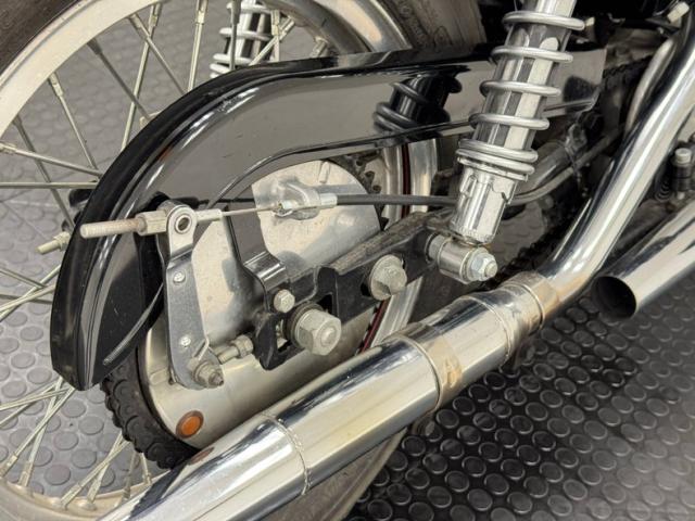 Fitted into the frame is a 1000cc V-twin putting out 55 horsepower and fueled via a 1-barrel carburetor. A 4-speed manual gearbox sends power to the 18-inch wheel in back via chain drive. Drum brakes are utilized front and rear while the dual exhaust exits on the right side with shorty pipes. Suspension consists of a telescopic fork in front and double coil overs in back.