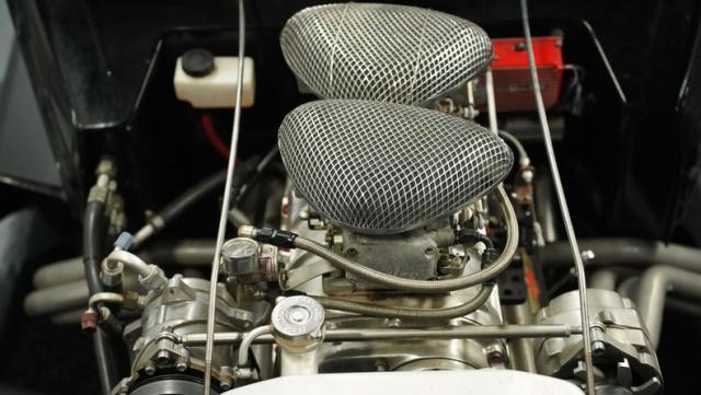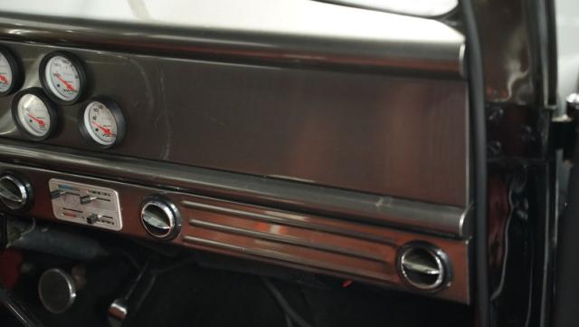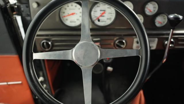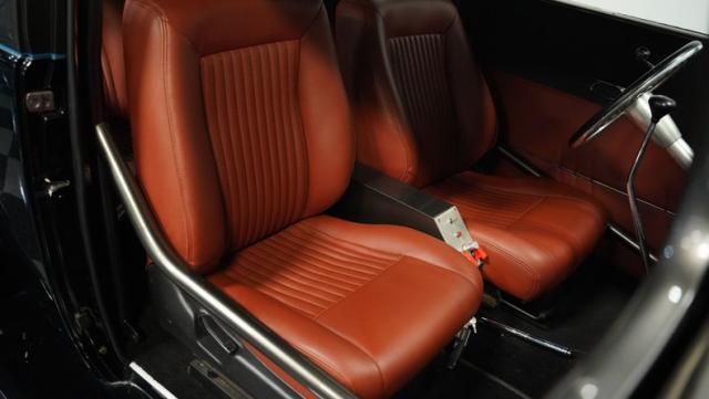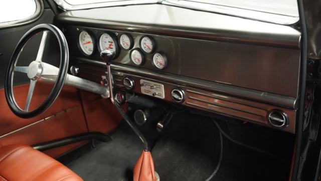 Inside, caramel leather bucket seats invite you to grip the wheel and unleash the beast. The custom rear bucket bench seat echoes the front, creating a cohesive race-inspired cabin. Door panels and trim match the seats, while a fixed roll cage adds both safety and style. The dash houses cleanly installed Auto Meter gauges, giving you all the vital info at a glance. A low-profile shifter and straight shaft steering column complete the race-ready feel, while a custom metal console houses the starting sequence electronics.