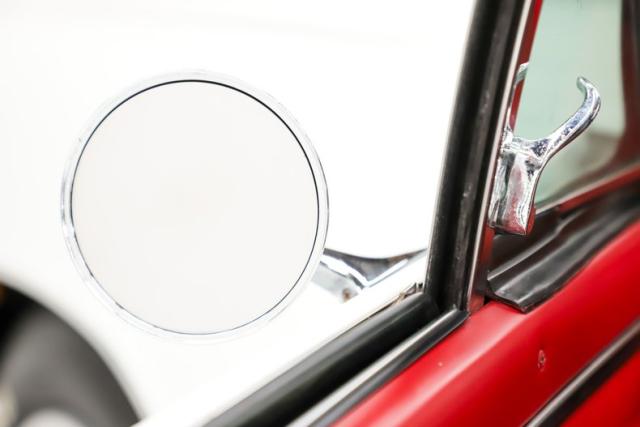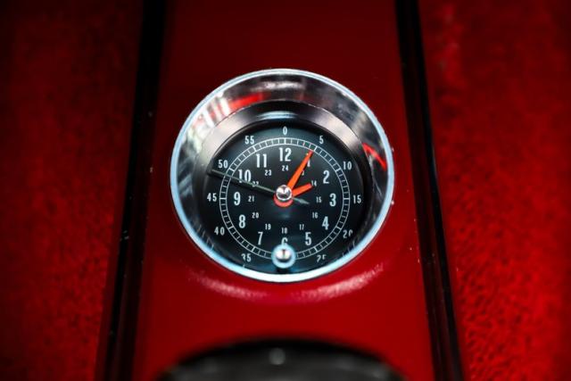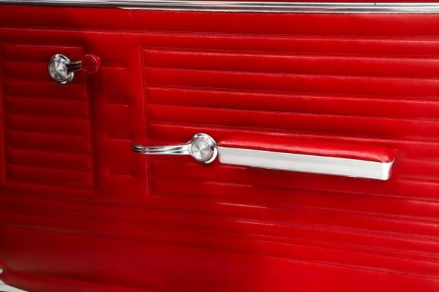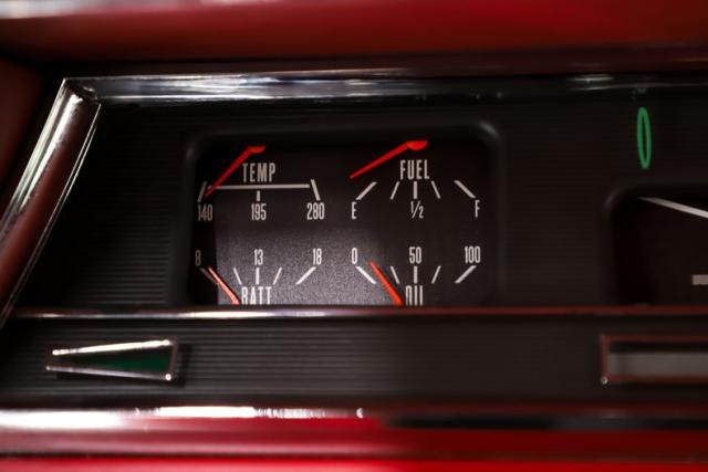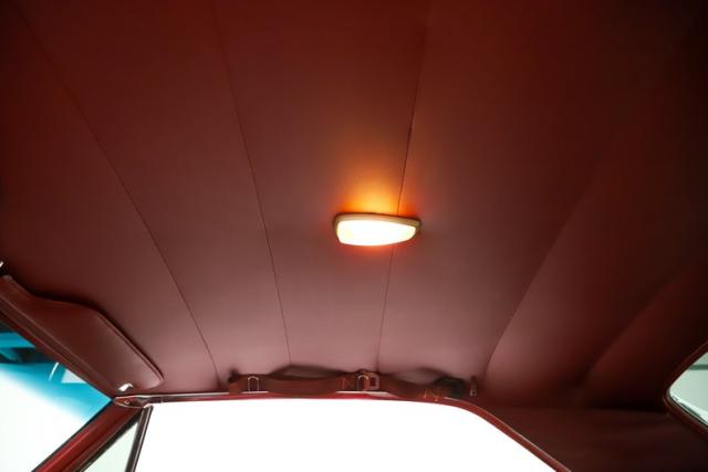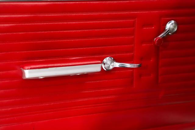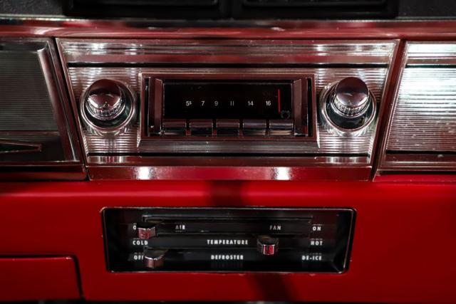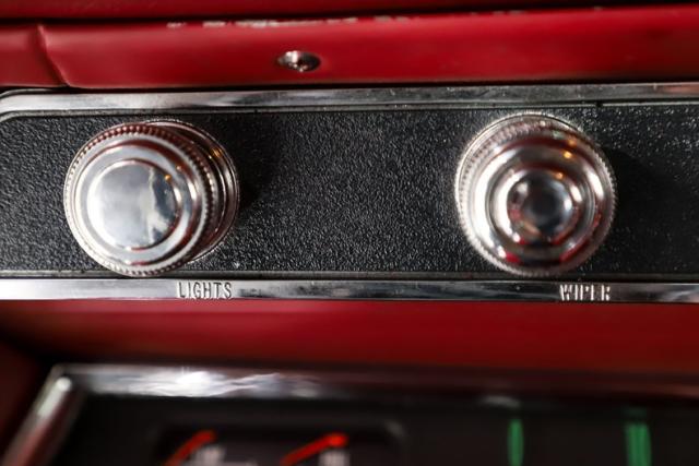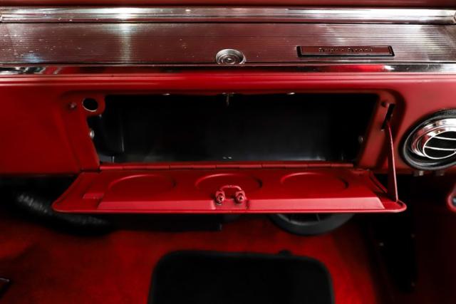INTERIOR: Wow-the red interior really sets this car off with a bright, fresh look. The door panels, armrests, carpet, headliner, and visors have all been replaced, and the seats have been re-cushioned and upholstered. The vibrant red carpet and factory center console with clock really bring it all together. The dash pad has been replaced, and the gauges have been upgraded to modern units with a retro appearance, including a tachometer. It also features upgraded electric slide controls for the A/C, along with a retro-style stereo in the factory location and 6x9 speakers in back for great sound.