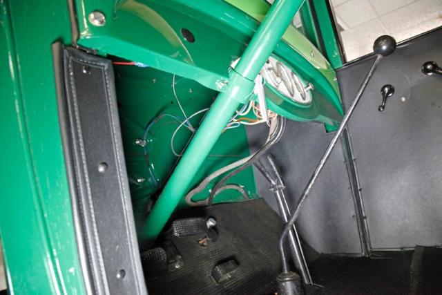 A newly refurbished and wrapped in black vinyl bench seat runs the width of the cab resting atop a box style mount. To the sides are the door panels covered in simple black smooth vinyl and the dash is steel, framed by some lime green paint on the upper dash with a nice curve. I nside this dash is an oval aluminum panel that houses a trio of oval instruments in perfect condition. Varnished pine wraps the original steering wheel, and s with throttle and spark advance . Rubber flooring has been installed, and the interior roof, (headliner), of the cab is green painted steel which turns to vinyl/canvas for the bed. Very nicely restored, all in nearly perfect condition.