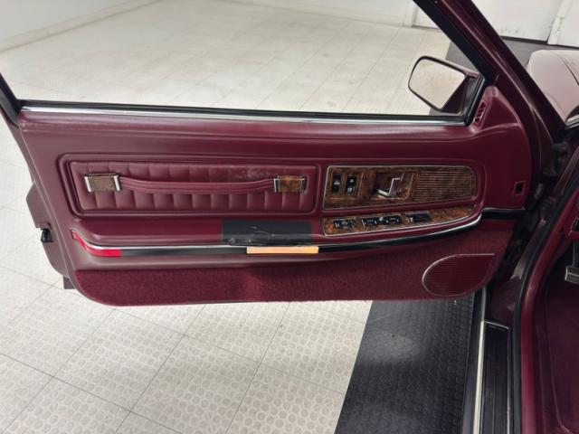 In the pinnacle of early 90\'s luxury, simulated burlwood was used to dress up interiors, and we see it here on the door, a nice contrast to the red vinyl inserts and carpeted lower as it surrounds switchgear on both doors. The drivers\' side shows some patina with taped repairs and some wear near the door pull. Leather bucket seats are in good standing with some typical compression and wrinkles for the pilot and both front and rear occupants share a center armrest with a wall cloaked in dark red the Europeans would call oxblood. A rather plain steering wheel presents to the driver, one horn cover coming loose, and fronts a burlwood dash face plate that runs the width and frames the fully digital instrument cluster reminiscent of early computers before Apple came along. The center stack favors the driver and holds the climate control panel and familiar Delco radio. Full words instead of letters indicate what gear you\'re in and they are changed via the stout T-handle shifter in a sea of faux burlwood. Plush red carpet below, a felt like headliner above, which is newer, and a fully finished and clean trunk completes our tour of this survivor\'s clean interior.