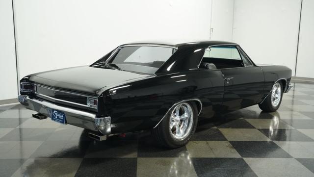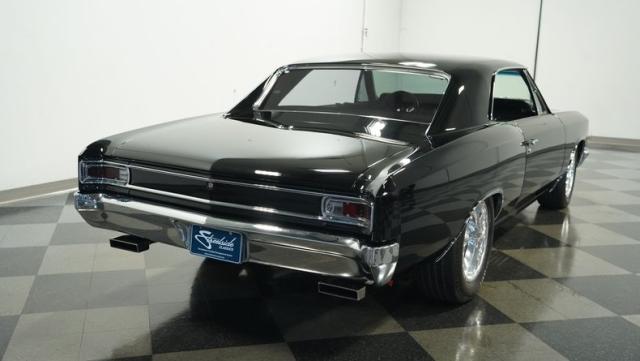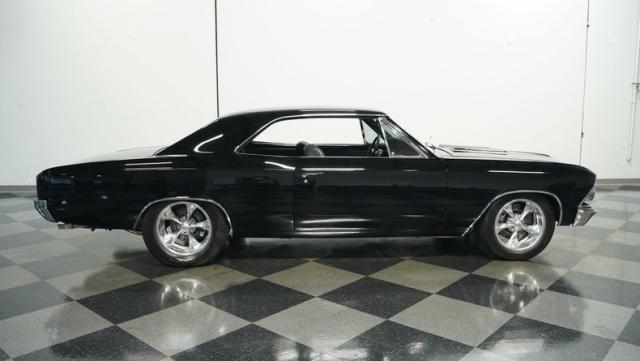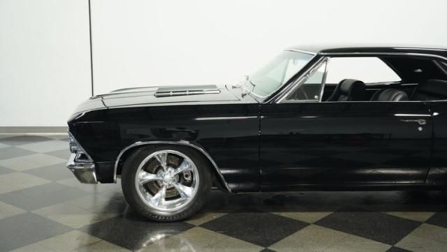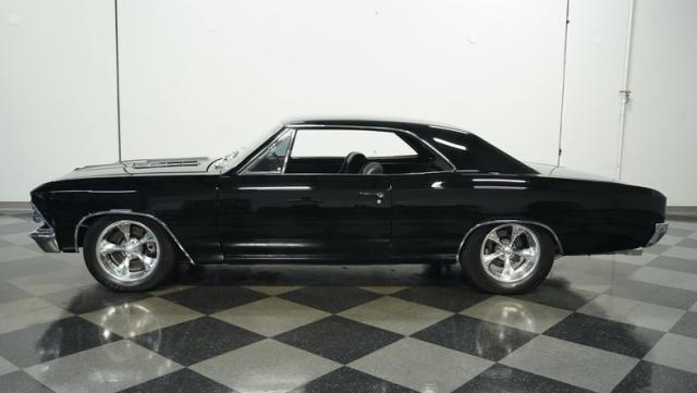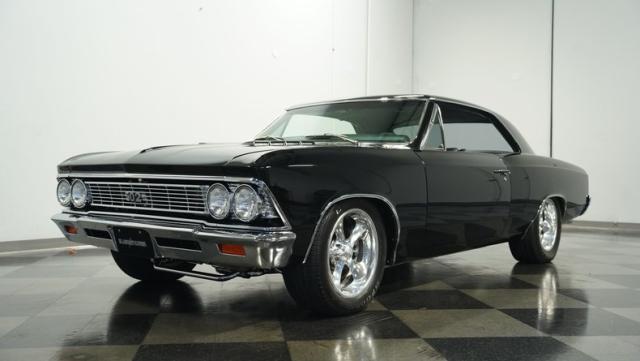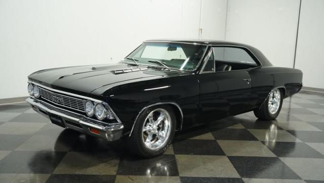 This 1966 Chevrolet Chevelle 502 Restomod is a black-on-black beast that\'s racked up more awards than most cars see in a lifetime. With its first show appearance netting Best of Show at the 2004 Super Chevy Show in Commerce, Georgia, this Chevelle set the bar high from the start. The slick exterior showcases immaculate PPG basecoat that emphasizes every muscular curve of the iconic A-body. Custom Boyd Coddington wheels, 17 inches all around, fill the wheel wells with 245/50R17 rubber up front and meatier 255/60R17s in the rear. The stance is aggressive yet refined, thanks to a 1-inch drop courtesy of Hotchkis components. Sequential rear turn signals and a fiberglass hood with a subtle air scoop hint at the performance upgrades lurking within.