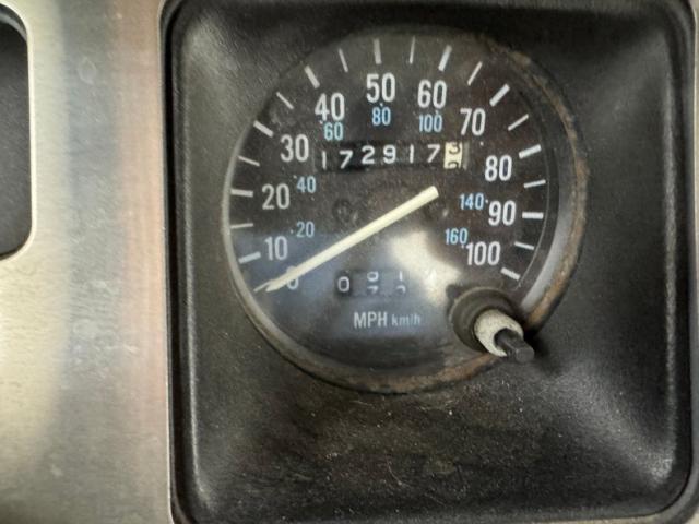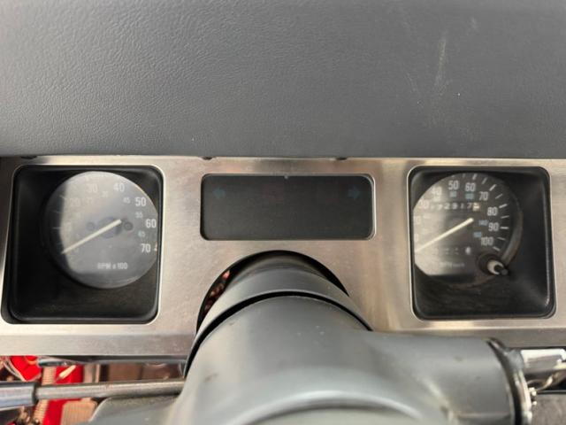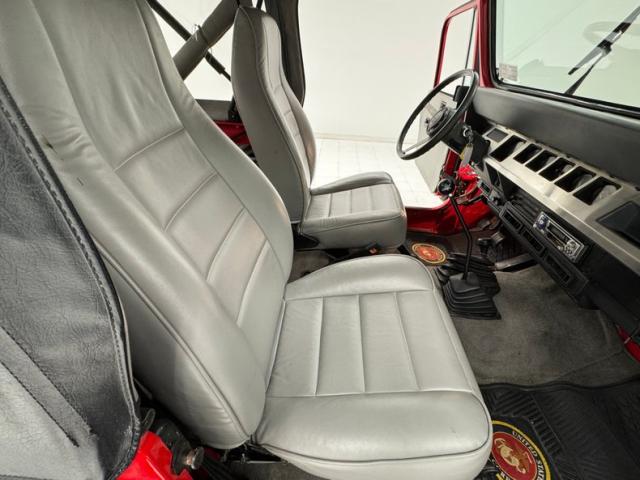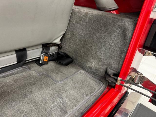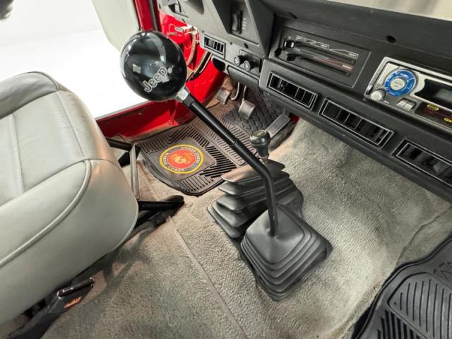 Smooth gray vinyl covers the door panels and also the bucket seats, all in good shape. There\'s the characteristic small bench in the back and it too, wears a covering of gray stitched vinyl. The instrument cluster not only runs the width of the dash, but the round gauges are housed in square bezels, continuing the boxy theme to this 4x4. An AM/FM/Cassette radio has been added and the Jeep has air conditioning. The shifter and transfer case selector rise from the floor cleanly, surrounded by gray carpet which extends all the way to the rear cargo area. We have padding and grips on the rollbar and clean surfaces on the inside of the soft cover.
