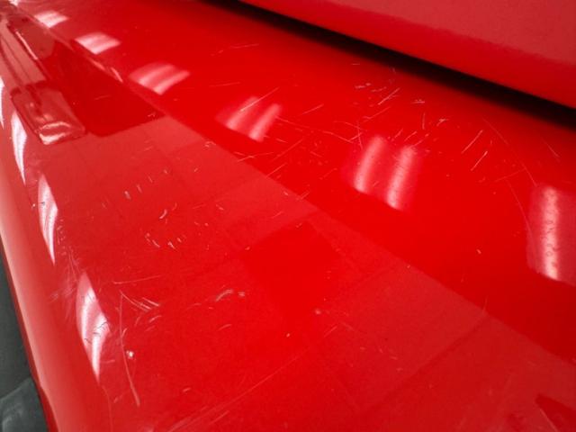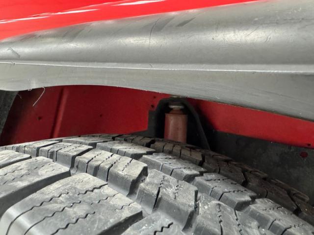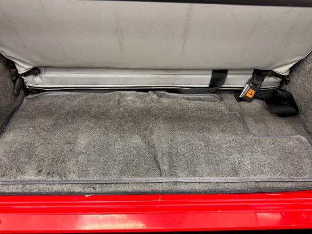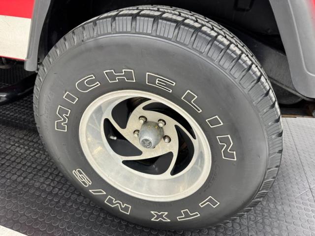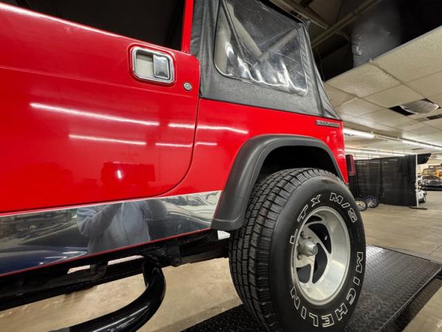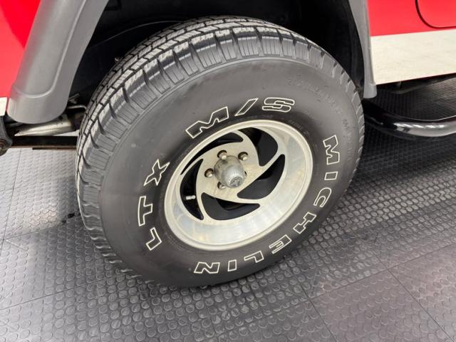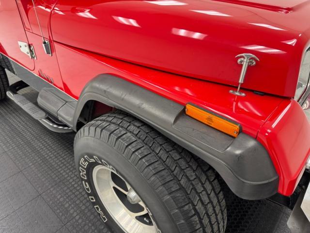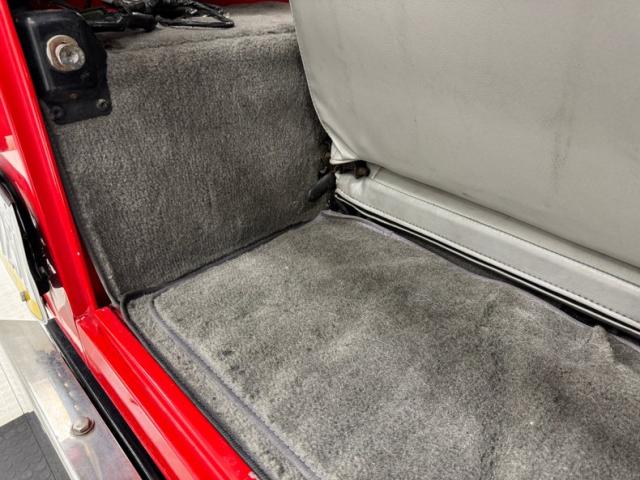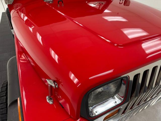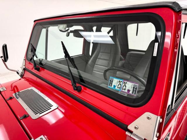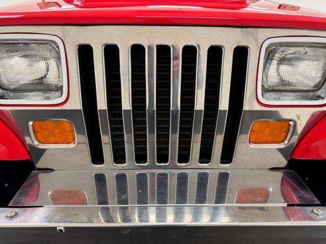 As a first gen YJ, this 1989 features square headlights which were subject to some early consternation but eventually gained wide acceptance. On this car, they\'re framed in a dressy chrome grille and outlined in red, matching the exterior\'s Bright Red coat of paint. The bumpers are polished metal and a band of trim runs along the rocker panel that also features a mirror-like finish. Hinges, latches, door handles, and mirrors add yet more bling while black highlights include the fender flares, nerf bars, and canvas top. It\'s all brought together with the 15-inch American Racing wheels which have black inserts and LT rated Michelin tires. Imperfections include a few scratches and scuffs.
