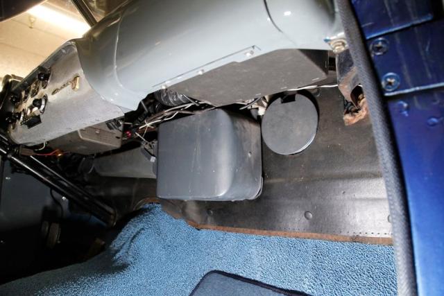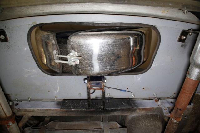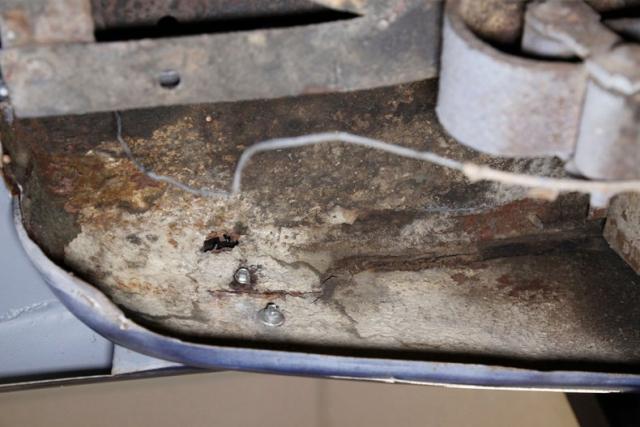 A thick coating of rustproofing covers the floor pans, rockers and toe kicks. Frame and flooring show surface rust on the untreated sections as does the suspension but all remains structurally solid. Body hangers, suspension parts, and gas tank are good as well. A dual exhaust system with Cherrybomb mufflers has been installed and we note drum brakes all around. For the suspension we see an independent coil spring arrangement on the front and a leaf spring set up on the rear.