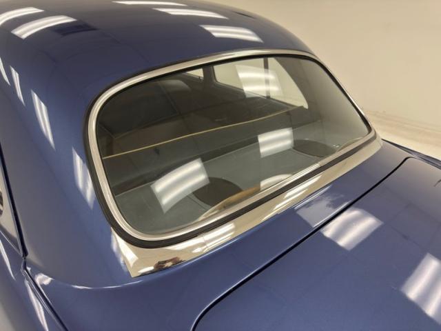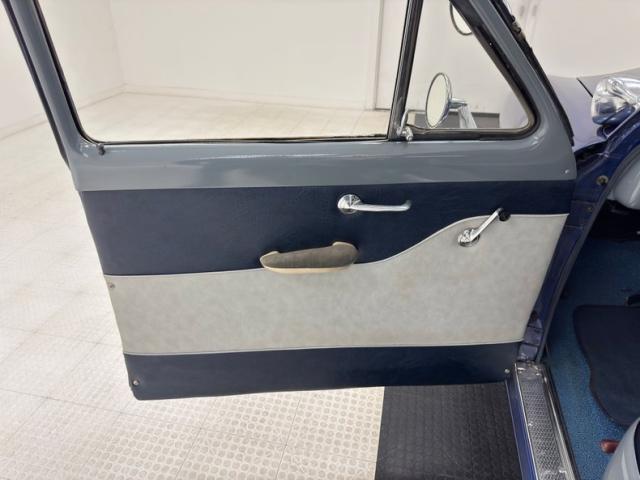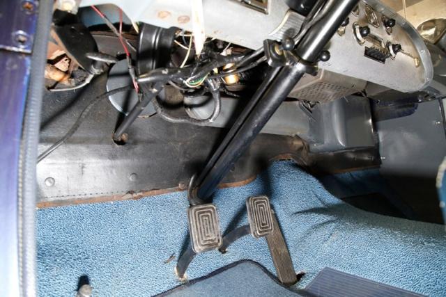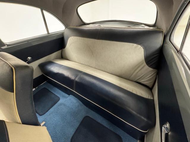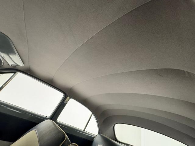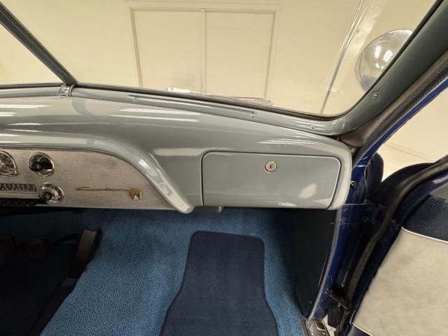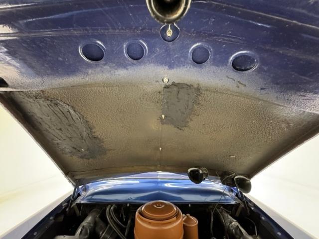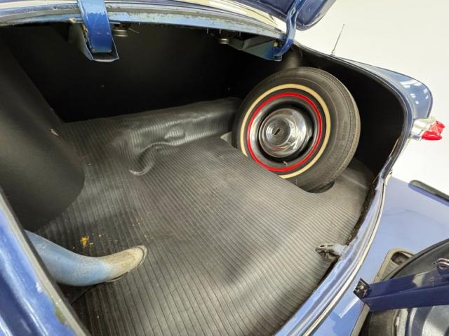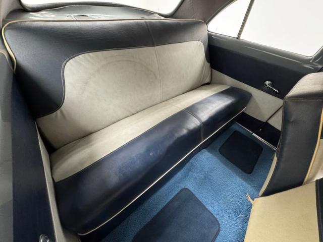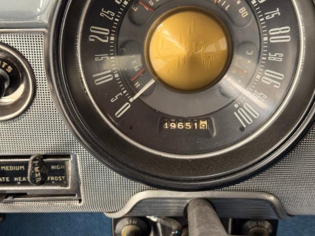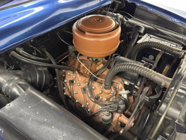 Blue bolsters with ivory inserts all in vinyl cover the benches, which are front split, and rear bench. White stitching along with white piping sets the seats off nicely. The front seats have a large seam separation on the driver\'s upper cushion that most likely can be repaired fairly easily. This blue and ivory shows up on the door panels as well and a gray steel border up top and some chrome and bakelite handles within. Light blue low pile carpeting is on the floors and is protected both front and rear with navy blue mats. In front is the original dash with light gray sprayed metal top, and an interesting mesh chrome front board with all the standard insert knobs, radio and speedometer. A Ford bakelite black steering wheel in chevron styling fronts the dash. The headliner is gray, tight and very clean.