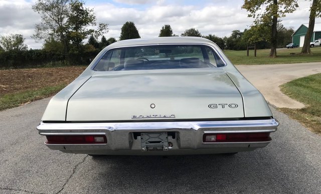 This is a 1972 Pontiac GTO hardtop. with the original 400 cu in engine, 4 BBL, dual exhaust with factory exhaust splitters, power steering, power disc brakes, tinted glass, and four speed manual transmission. A built in am-fm stereo radio with built in 8 track player was installed in the car when new. A true time capsule with 15,000 actual miles from new with all original paperwork including the original title. Was put away in 1976 and still sports the 1976 Virginia state inspection sticker. Has original Goodyear Polyglas raised white letter tires, all original hoses, belts, etc. Runs and drives out like it did in 1972.