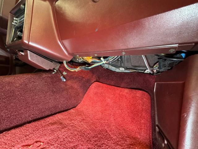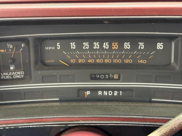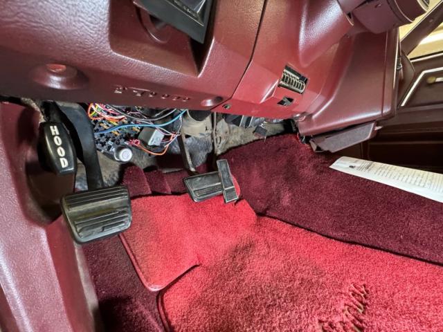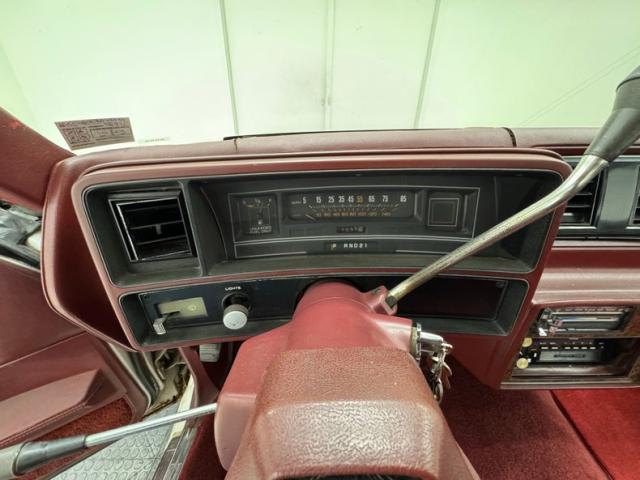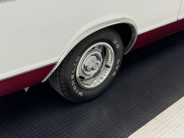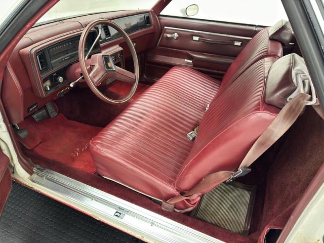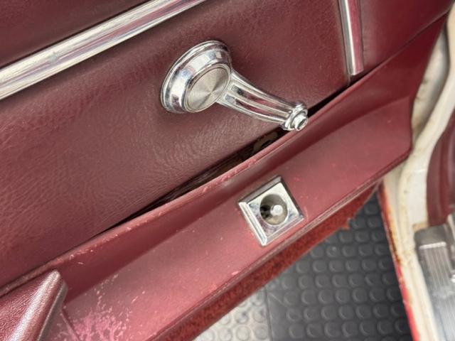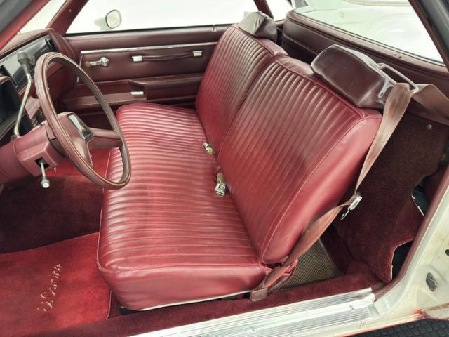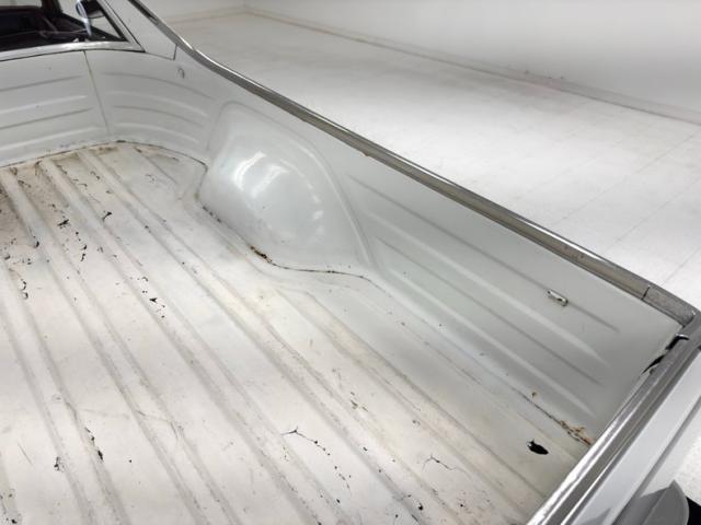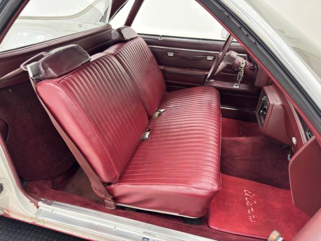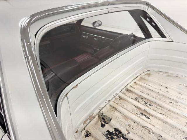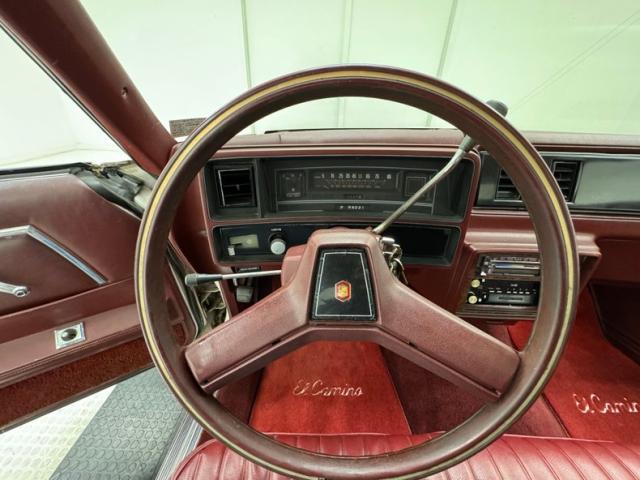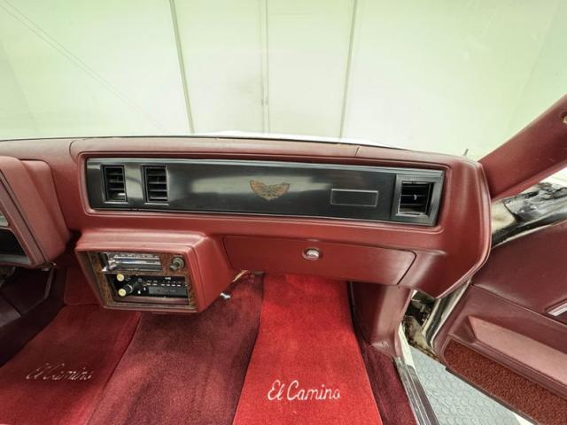 The red vinyl door panels show some patina with scratches, loose inserts, and missing knobs but the bench seat is in very good shape with just a few checks in the side piping. The original steering wheel fronts the standard dash, a horizontal speedometer, gas gauge, odometer, and gear indicator and that\'s about it other than indicator lights. The center stack has an A/C panel although the A/C is no longer in the car, and a Delco AM/FM radio over red carpet in good shape, protected by El Camino embroidered mats. Up above a few dimples appear in an otherwise clean headliner and the visors look perfect. There is no radio in the car.