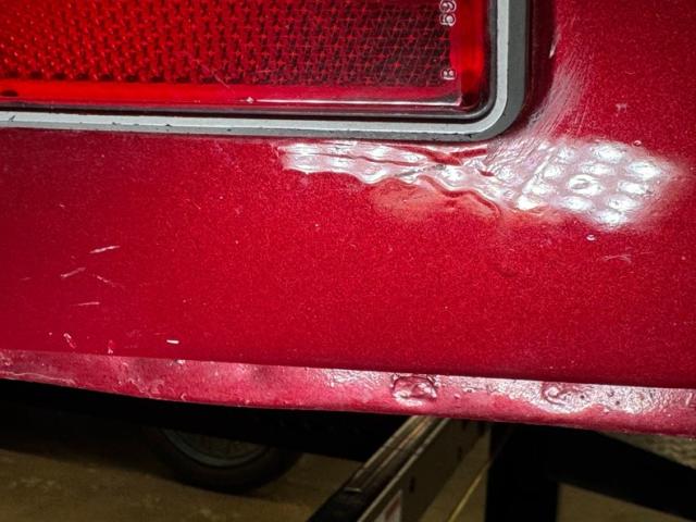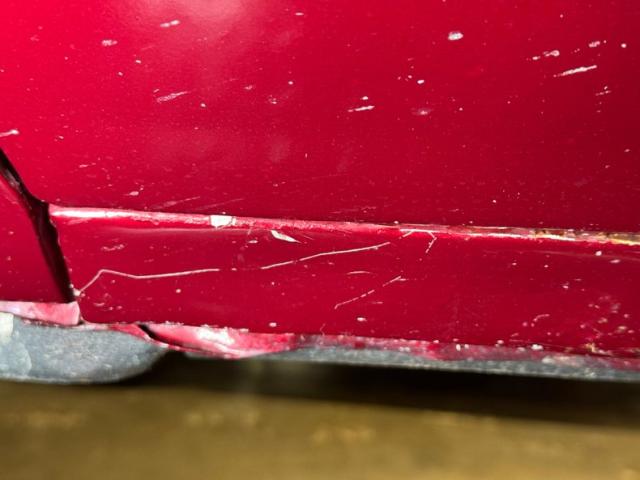 It\'s a Chevrolet Malibu coming at you, but from the side, the El Camino makes its mark, here dressed up in stylish white with maroon rocker panels and strobe stripes that ride the fenders and shoulder line and turn the corner to color the tailgate as well. A maroon bowtie has been added on that tailgate which goes with the Heartbeat decals on the side while the distinctive rear bumper holds the tail lights down low. C-pillars flare rearward creating buttress like panels beside the solid rear window and the A-pillars mirror the angle below a short roofline. 14-inch Chevrolet Rally wheels serve as the shoes here and look great and the bed is usable because it\'s been used. You won\'t be making the first scratch or mark, they\'re already there! Most of the other imperfections are centered around that red rocker where we find chipped paint, scratches, and paint runs.