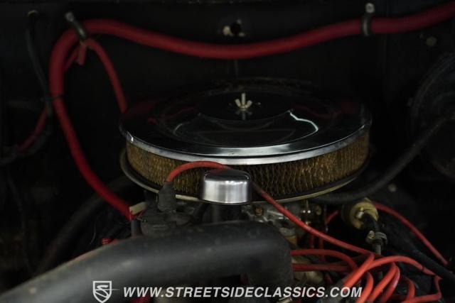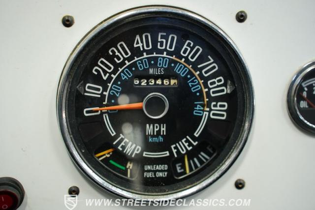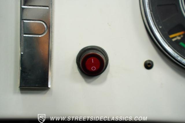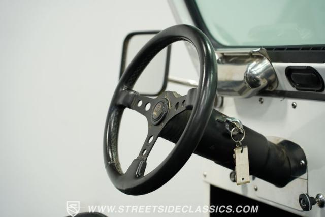 Inside, we find a clean, Spartan interior with a body-color dashboard, high-back vinyl bucket seats up front and a matching bench in back, black carpeting, and a roll bar. Adding to that, a body-color fire extinguisher is included, highlighting the attention to detail this truck has received during its restoration. A three-spoke, power-assisted Grant GT steering wheel sits just ahead of a chrome windshield wiper motor cover that matches the knobs used to collapse the windshield, as well as the expletive bar in front of the passenger seat. A simple three-pod gauge cluster sits in the middle of the dash, while the floor-mounted gearshift sits next to the dual-shifter four-wheel drive transmission controls, further proving this truck\'s readiness to go off-road.