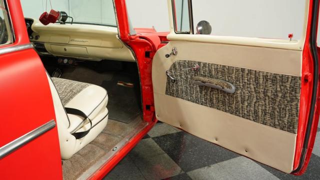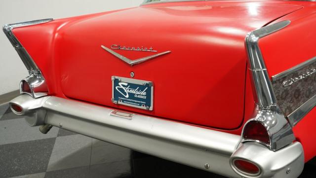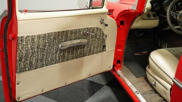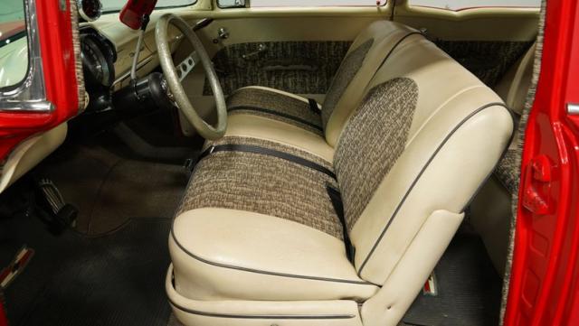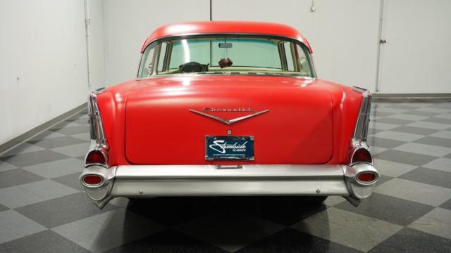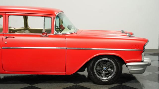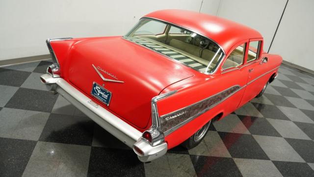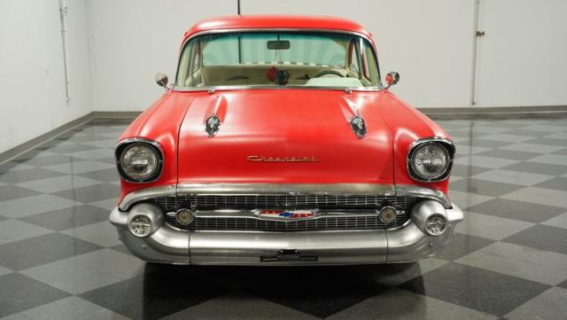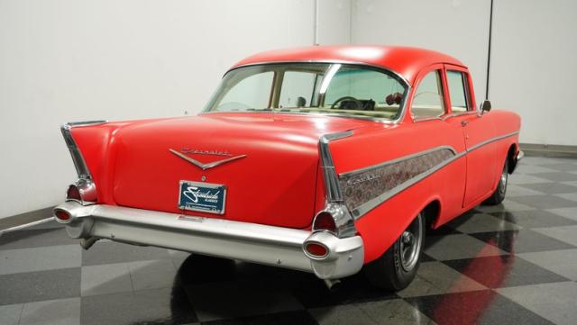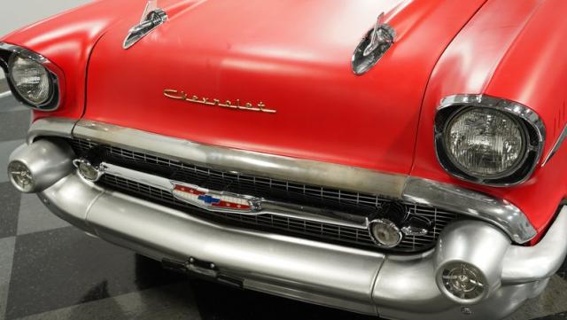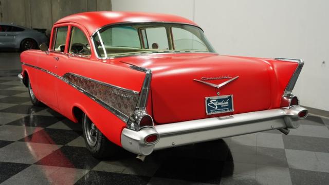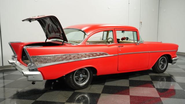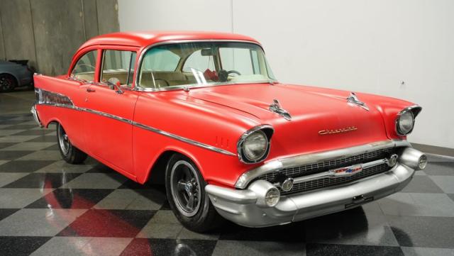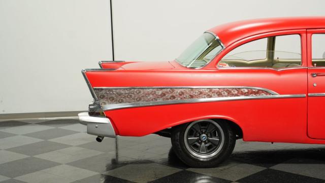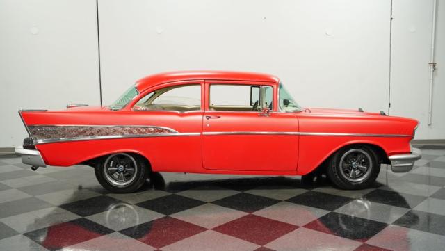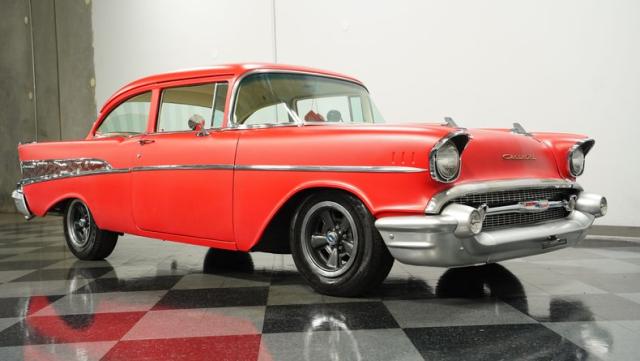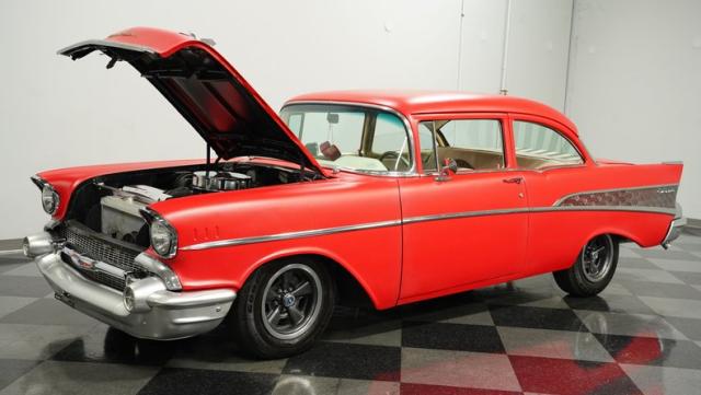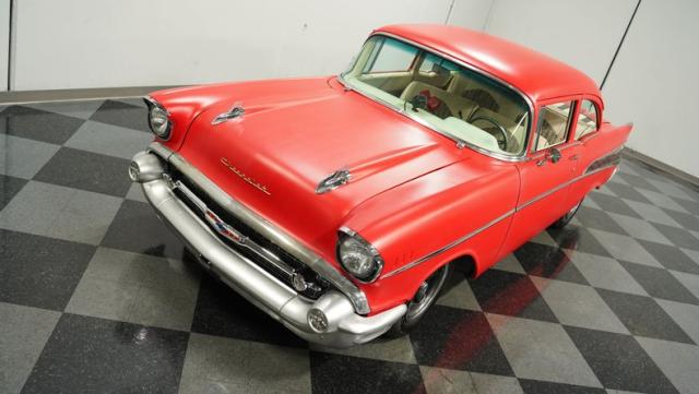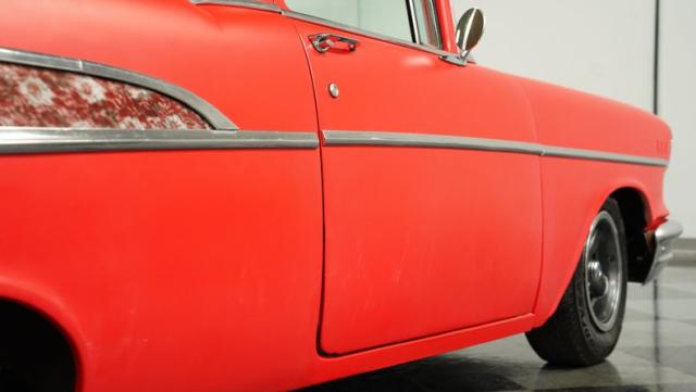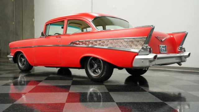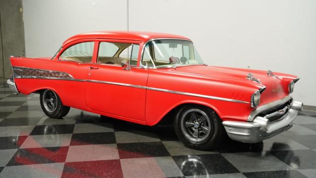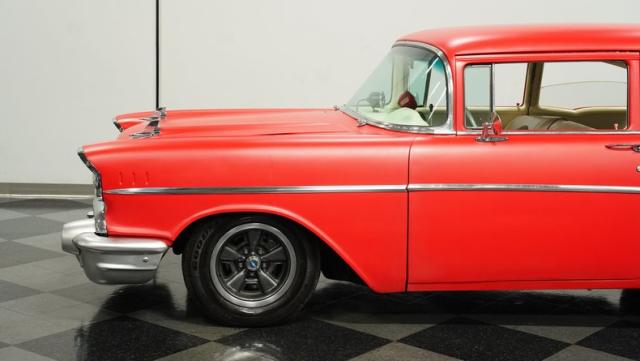 This 1957 Chevrolet 210 features a potent 454 V8 engine, an interior that marries style with substance, and a distinctive flat red exterior highlighted by painted stripes. It combines classic aesthetics, modern enhancements, and undeniable power. Call today!