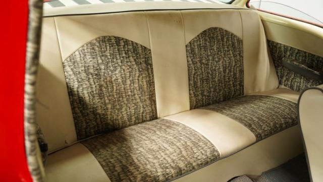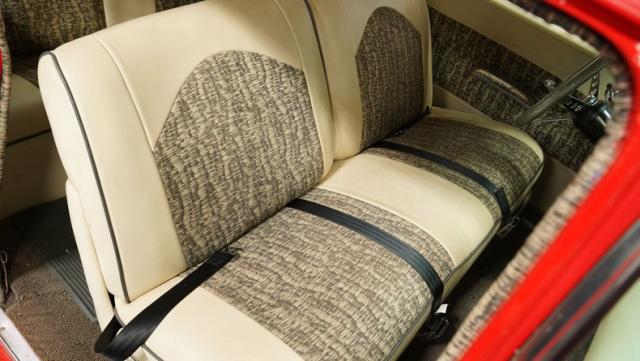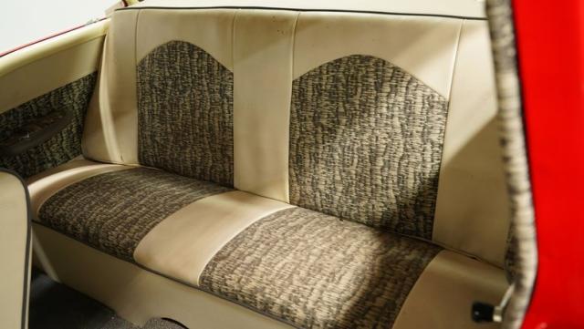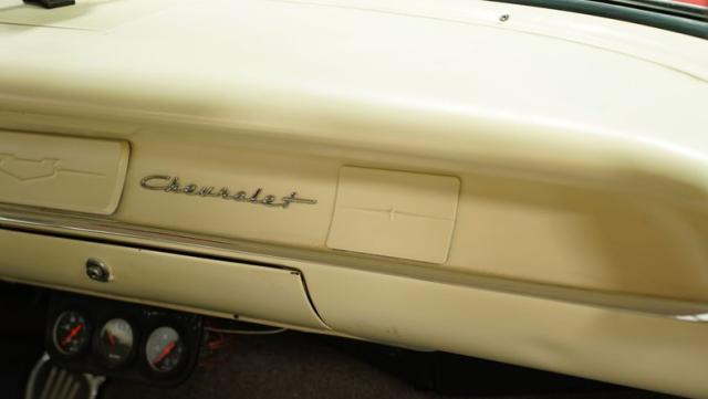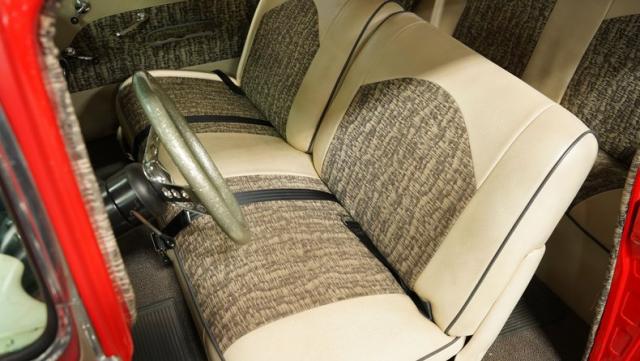 Step inside to discover a tastefully executed interior that weaves charcoal and ivory into a captivating color dance. The split-bench seats, cloaked in cloth, invite passengers to linger. A column shifter enhances the vintage ambiance, while a center console offers a nod to modern convenience. A metallic flake steering wheel, Mooneyes-style gas pedal, and a trio of gauges under the dash inject the perfect amount of flair, transforming every journey into an occasion. The tuck-and-roll trim panel on the rear package tray adds a stylish flourish.