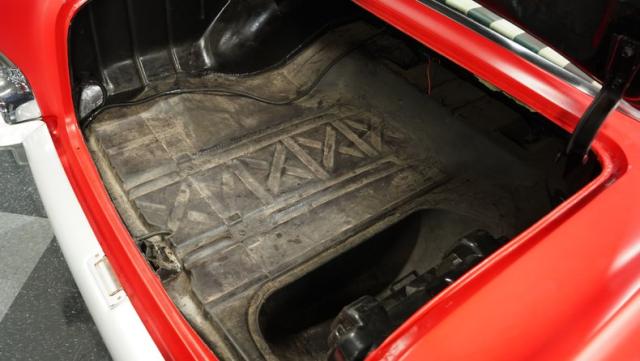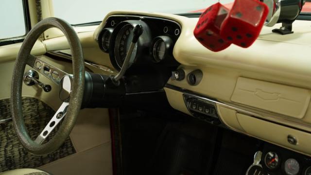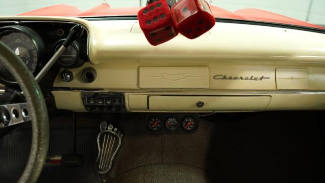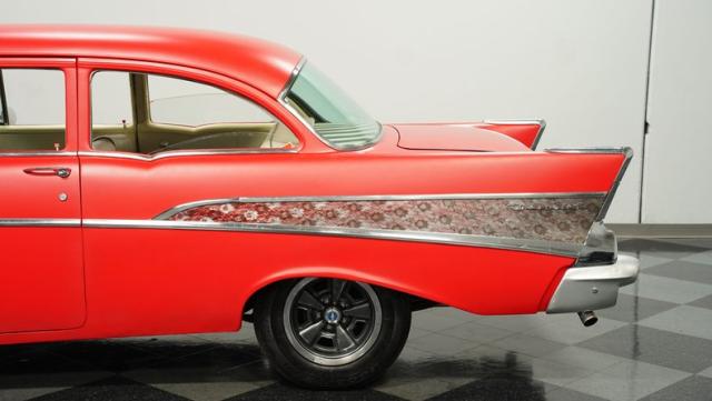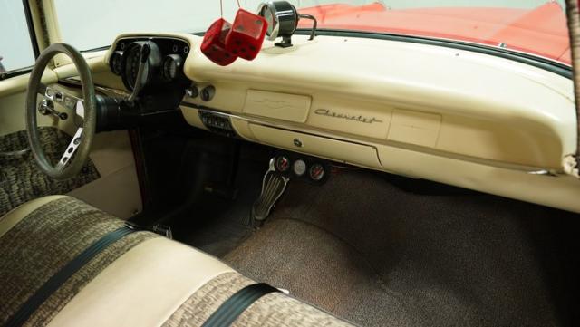 This 1957 Chevrolet 210 showcases its heritage with a striking flat red exterior that radiates a cool, rat rod vibe, enhanced by custom lace work on the side panels. These artistic touches are further accentuated by a psychedelic floral pattern in the trim, introducing layers of intrigue. It rides on 2nd gen Camaro wheels enveloped in 205/75R15 tires, which complement its confidently lowered stance. The front and rear bumpers shine in silver, and painted stripes run the length of the body.