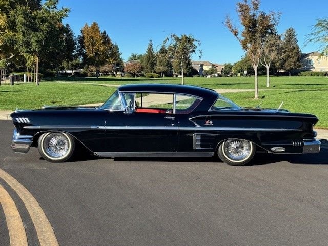 This 1958 Impala, black with a stunning red interior, is believed to have only 50,000 original miles and is in excellent condition inside and out. All original drive train and original rear end. Power is supplied by a 283 V8 with a 4 core radiator backed by a 3 speed manual transmission on the column, bringing back the good old days when driving was so much more fun. After market air conditioning, up graded sound system to roll with your favorite tunes, and lowered just right sitting on Astro Spokes wheels to give her that too cool for school look. This car is located in Brentwood, Ca. Offered at $64,500 OBO. For more information please visit our website at www.classiccarmarketing.net or call us at 619-972-7073. Please mention the vehicle you are inquiring about so we can respond promptly. Inspections are encouraged before any purchase, of any vehicle, anywhere.
