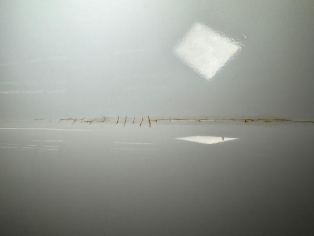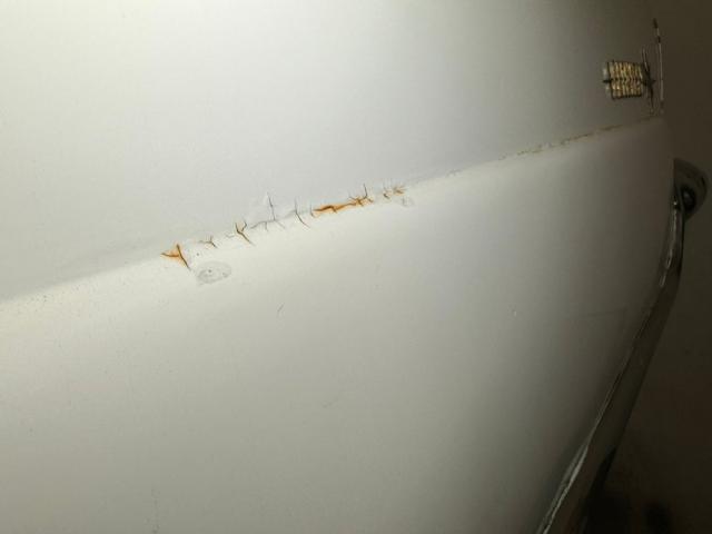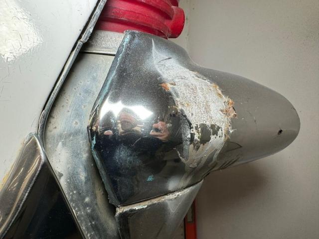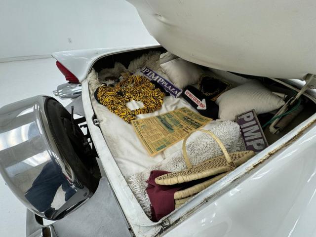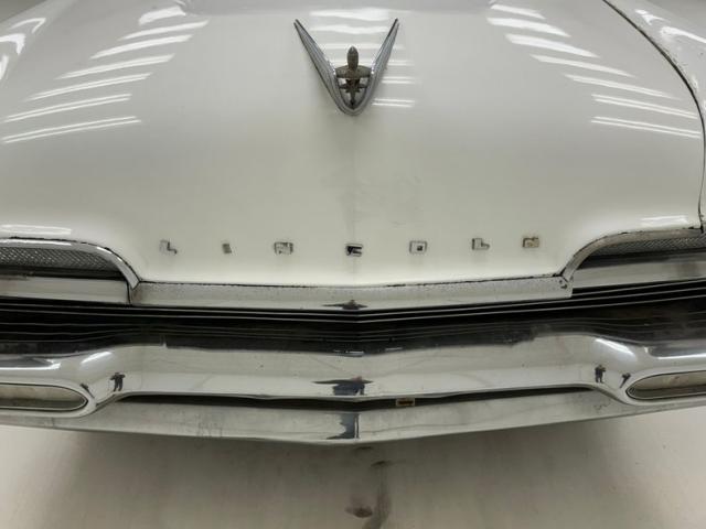 With its borrowed headlight shape from the Lincoln Futura, it is looking much like the St. Louis arch with the bezels and descending waterfall vents on either side. Just below is a horizontal ribbed grille with a large bumper topper running through the middle housing the ovoid styled turn signals. More horizontal ribbing is seen below this, and then the massive lower bumper for the bottom caps things off. Topping the hood is a beautiful large hood ornament in the form of a gold knight in winged swept back armor torso, and he sits within a dual chromed V which streaks rearward towards the large windshield. Add in some L I N C O L N blocked type across the front of the hood and now we are dripping with chrome with some dimples and during showing for their condition. All this dripping is going on top of a Maaco coat of Starmist White paint which shows some doling, chip offs and areas of body filler sanded roughly then painted over with rattle can. Throughout the rest of the steel, we see more slathered on body filler, some cracking and underlying light rust developing, and chip off areas of said filler. Script Lincoln badging in your grandmother\'s handwriting, rocker trimming which begins on the front quarter as a spear, and runs rearward where it widens and frames the rear wheel well that has a fender skirt installed. On the back, large inverted V tail lights have a big rear bumper just below, which has tailpipes inserted along with the continental spare tire tray to make this car 20 feet long! The bumpers show chrome delamination and areas of dimpling. Thin whites and dog dish chrome wheel covers with a gold starburst, (think 50\'s!), are all around and all in fair condition. A shout out to the white painted roof, and all the chrome surrounding the wrap around windows, pillars and door sills...worth the price of admission just with this.