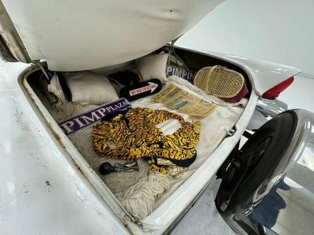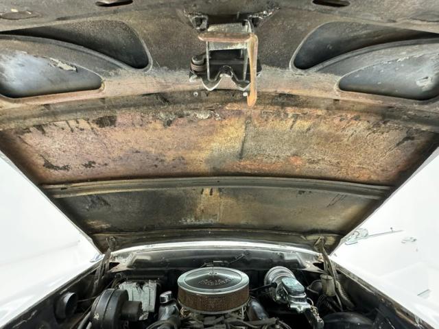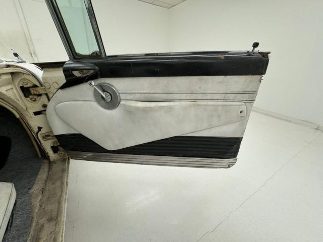 Some additional jet age styling inside on the door panels with sleek molded in door armrest/pulls, a rounded padded chevron white insert and some black vinyl for the sills. The panels are soiled and show plenty of wear, especially in the sills. The wing window crank is in a big round dish bezel with perfectly preserved stainless and a black strip runs below and is offered up in ribbed vinyl. A nifty molded-in courtesy light is just above the crank. I slip through the dirty thresholds and here I see a large split back bench with black tuck and roll inserts in tiger striped broadcloth, with white leather surrounding bolsters. These chairs are very rough with lots of cracking at the seams and severe wear on the leather entry bolsters. In back is a long rear bench in the same pattern as the front, with a white leather armrest in the center. Talk about mid-century styling, take a gander at the dash. It is loaded with innovative design, from the spaceship toggled air controls, to the cone shaped knobs with Bakelite and chrome, to the additional raised dash gauge cluster which pops out of the dash top in front of the driver. The dash utilizes a crushed oval style shape with the top being black and the bottom being white. Controls for power windows, power seats, a power antenna, power brakes, and numerous controls are positioned within reach of the driver. All in 50\'s style gray outdoor carpet is below, and a new white headliner is above in pristine condition and in contrast to the rest of the interior.