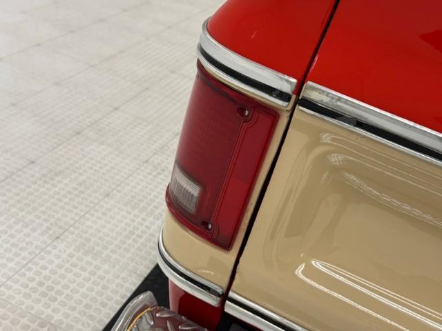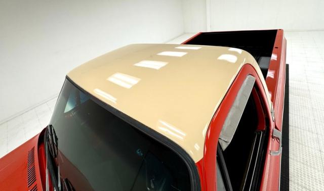 A restored exterior starts with two stage orange paint sandwiching a tan mid panel in a familiar period configuration. The cab also wears a tan cap creating a handsome profile at the end of a long bed. In back, a chrome bumper with diamond steel step surface hovers over a pair of exhaust tips and simple, wide tail lights flank the CHEVROLET embossed tailgate. There\'s chrome up front too, along with wide, chrome side mirrors and an aftermarket grille that replaces the egg crate style and bowtie. 15-inch chrome nugget wheels also look period and are wrapped in 75 series tires under wide wheel openings. The bed is painted black and shows usage and why not! That\'s a lot of space to use just for show! The truck presents cleanly, and most imperfections are found in the lower panel with some bubbling and uneven filler and the wheels suffer from some surface rust.