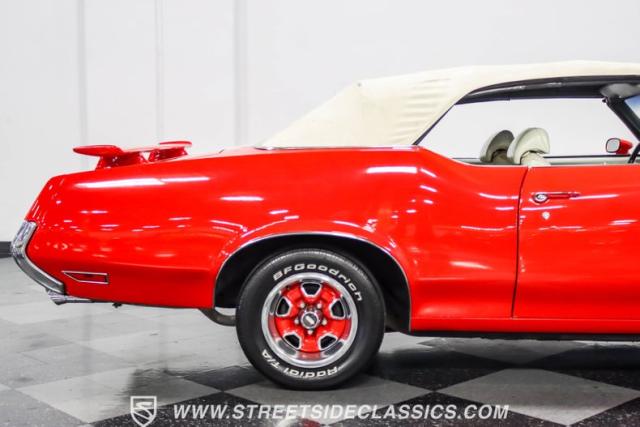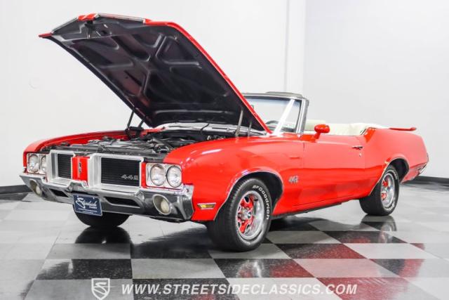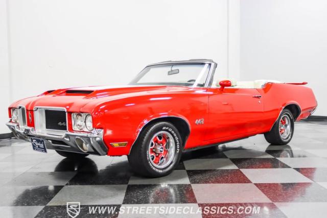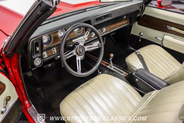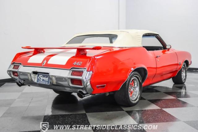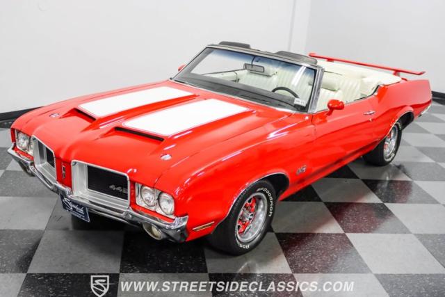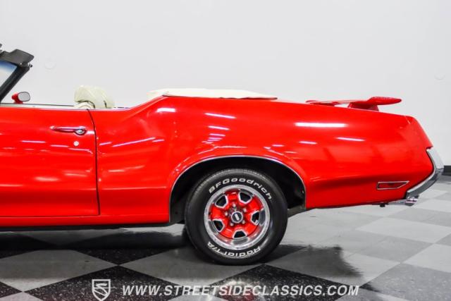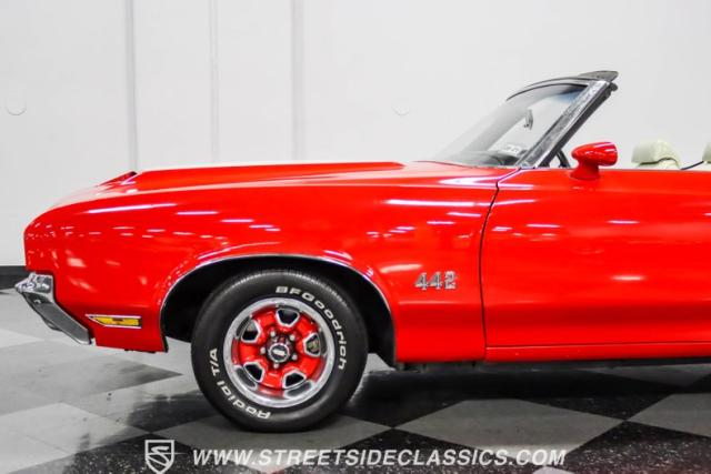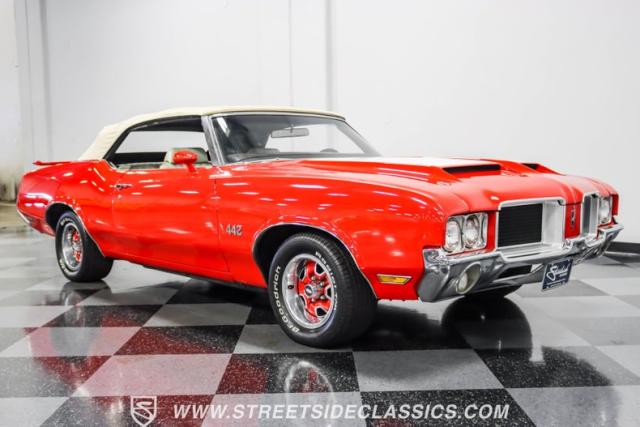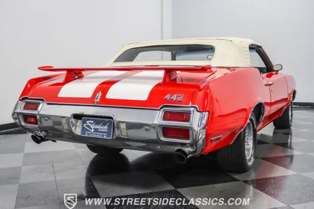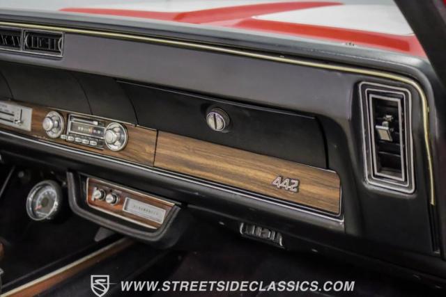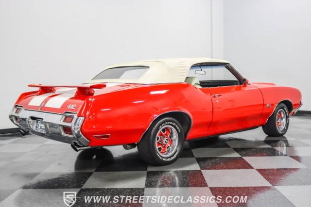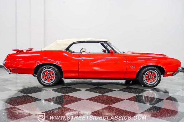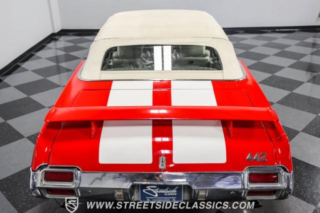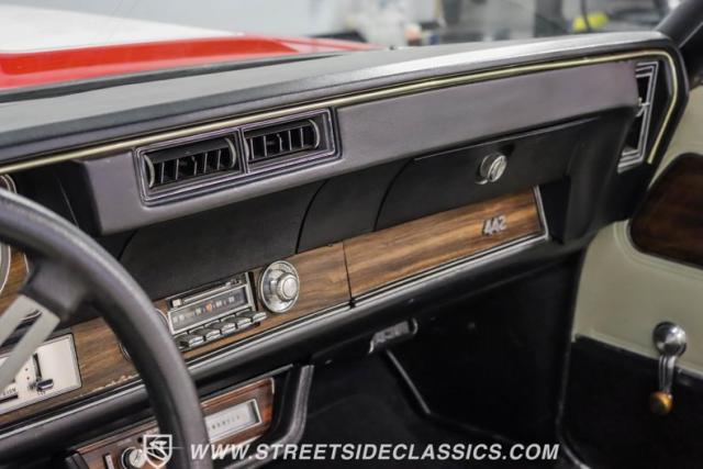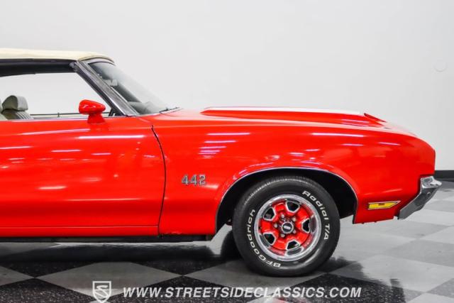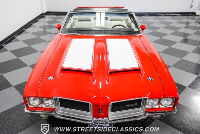 This 1971 Oldsmobile Cutlass 442 Convertible, one of only about 1,300 produced that year, marks the final run of the 442 as its own distinct model. Cloaked in vibrant red with contrasting white stripes, this rare muscle car demands respect. The power-operated white vinyl top with glass rear window completes its bold profile. Rolling on 14-inch wheels wrapped in BFGoodrich 265/50R14 tires, this Olds combines classic style with modern rubber.