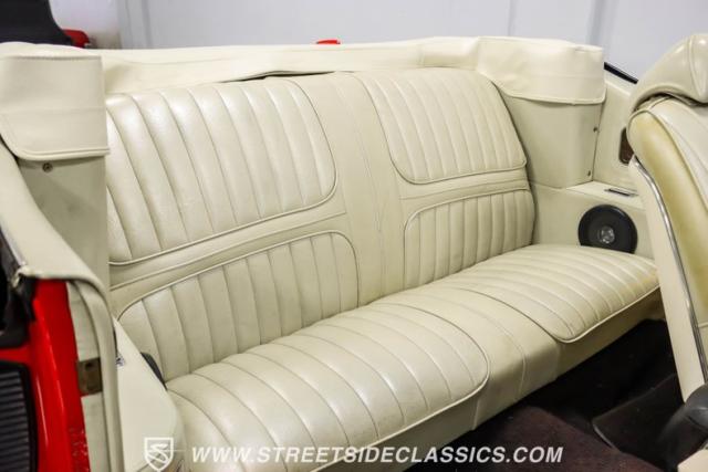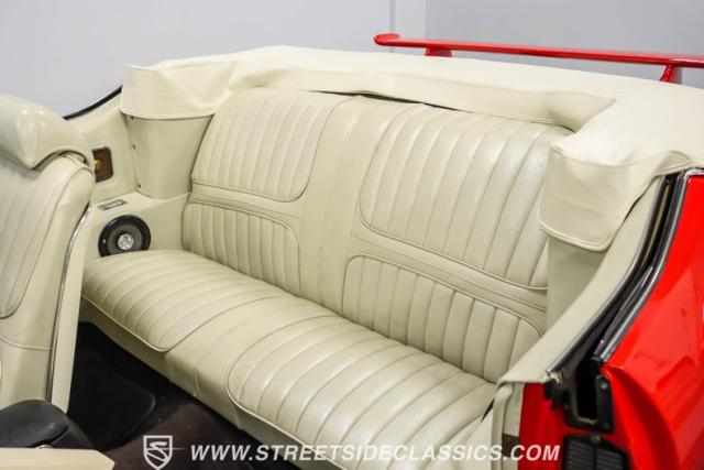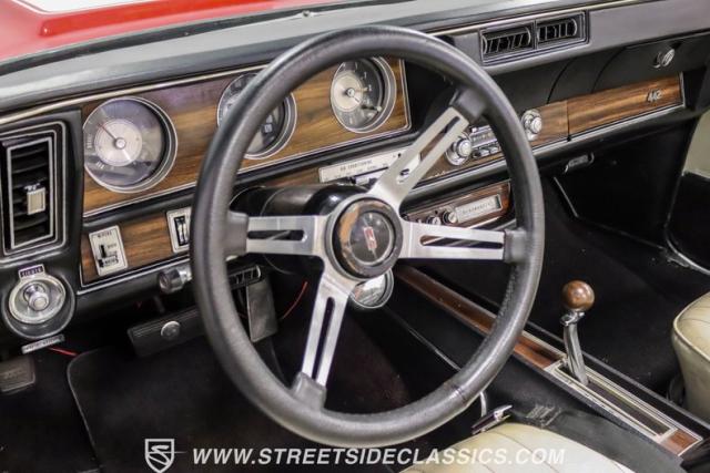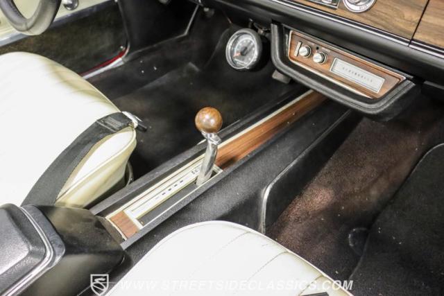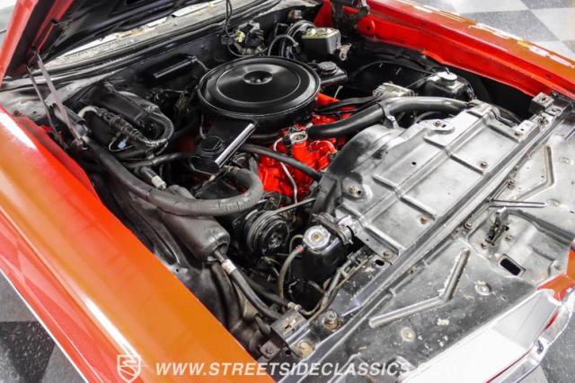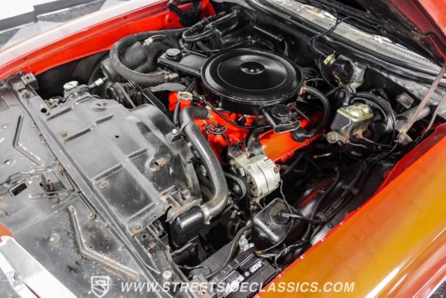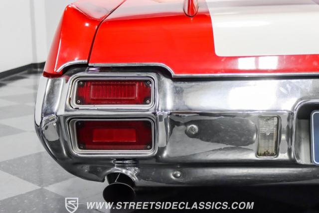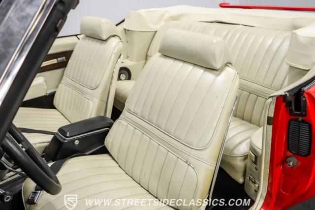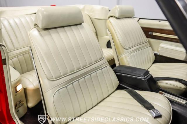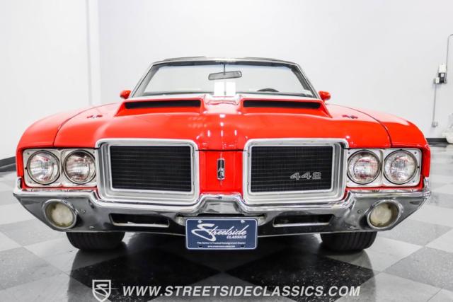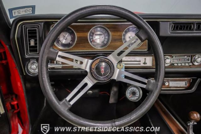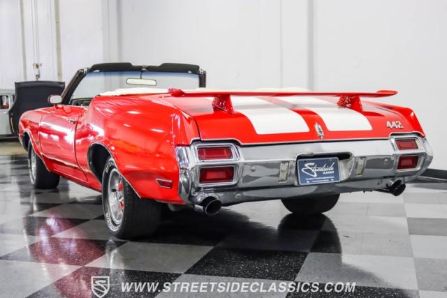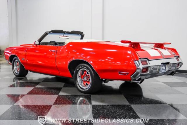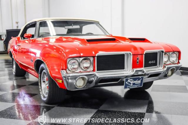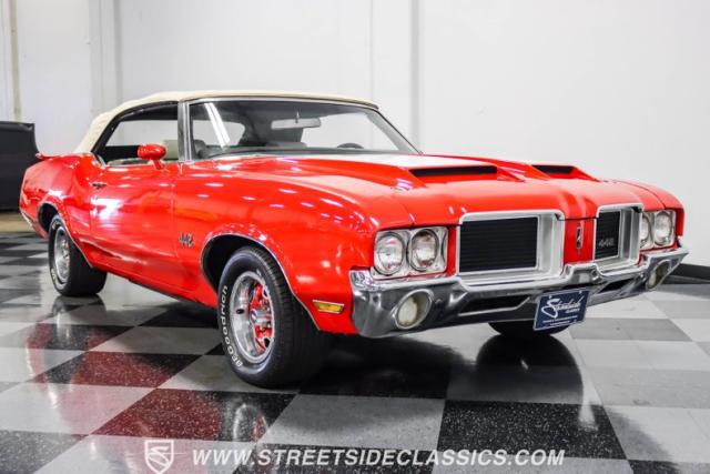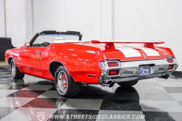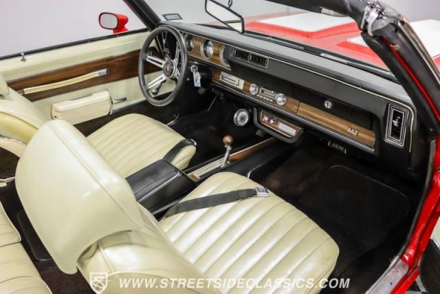 This 1971 Oldsmobile Cutlass 442 Convertible, one of only about 1,300 produced that year, marks the final run of the 442 as its own distinct model. Cloaked in vibrant red with contrasting white stripes, this rare muscle car demands respect. The power-operated white vinyl top with glass rear window completes its bold profile. Rolling on 14-inch wheels wrapped in BFGoodrich 265/50R14 tires, this Olds combines classic style with modern rubber.