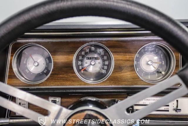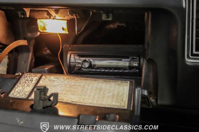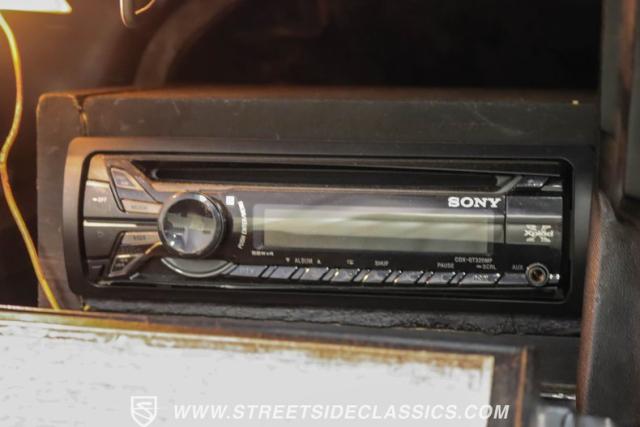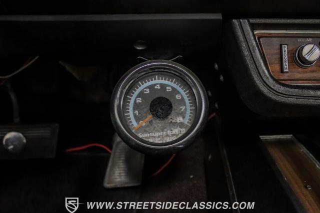 Inside, white vinyl bucket seats flank a floor-mounted shifter, creating a sporty cockpit. The dash houses factory gauges and the original radio with separate 8-track player, while a hidden Sony CD player in the glovebox provides modern tunes. Power steering, power brakes, and air conditioning ensure comfort during cruises. Custom floor mats add a personal touch to the cabin.