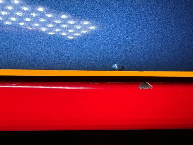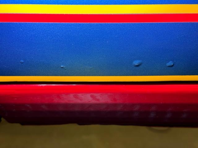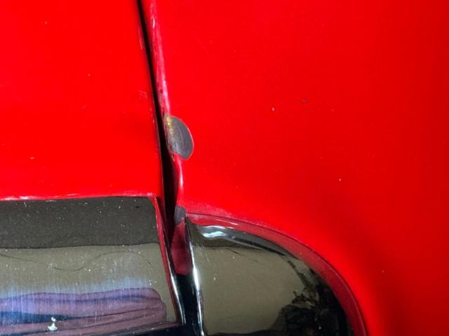 This is not your grandfather\'s Henry J and is dressed in a wild coat of Bright Red and blue and yellow graphic stripes along the rocker panel and tastefully contouring along the subtle rise of the rear panel. The next thing that gets your attention are those deep dish 15-inch Weld DragLite wheels in back, tucked under and somehow fitting behind the quarter panel, while the wheel opening in front fully exposes the wheels there. In profile, the shape is absolutely unique with a surging front end leaning sharply forward, and an upturned tail with fin-like protrusions. But it\'s the front that may spark the most conversation with high, wide set headlights and a pursed lip-like grille that lacks a grille and is therefore thrust into prominence with nothing under it to balance the visual. There are Henry J metal name plates and some elaborate pinstriping in back along with a pair of bullet-like tail lights. Paint and metal are good with imperfections noted as some bubbling down low, some touched up chips, and some that haven\'t been touched up. Panel gaps are overall good and a touch less than perfect in others.