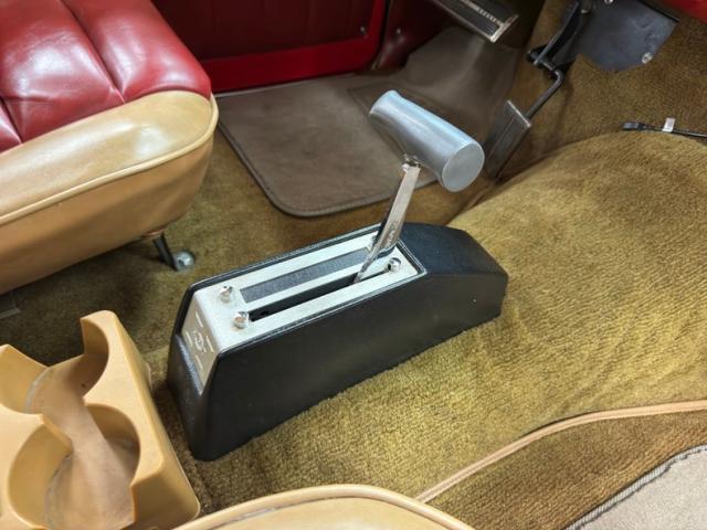 We leave 1951 temporarily and find a redone interior with Camel and Maroon leather that begins on the door panels that also sport external electric window units and original appearing door handle. Tuck and roll maroon inserts fill the bucket seats which are framed in camel leather, and the back bench with separate upper copy the pattern, all in good shape. A more modern Chrysler branded steering wheel that tilts and telescopes fronts an instrument cluster that is of similar vintage, with square speedometer in black plastic housing. An Allstate emblem adorns the black glovebox and the rest of the dash is color keyed to the exterior and within that red is an AM/FM/Cassette radio. On the center hump, a Hurst shifter arises from a simple box over tan loop carpet in nice condition. Above, the tan headliner appears to be perfect.