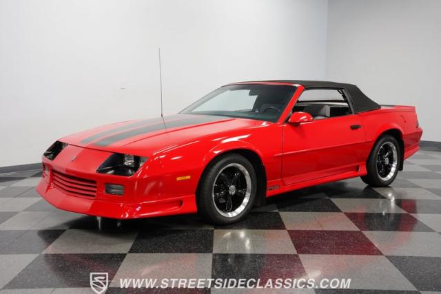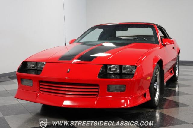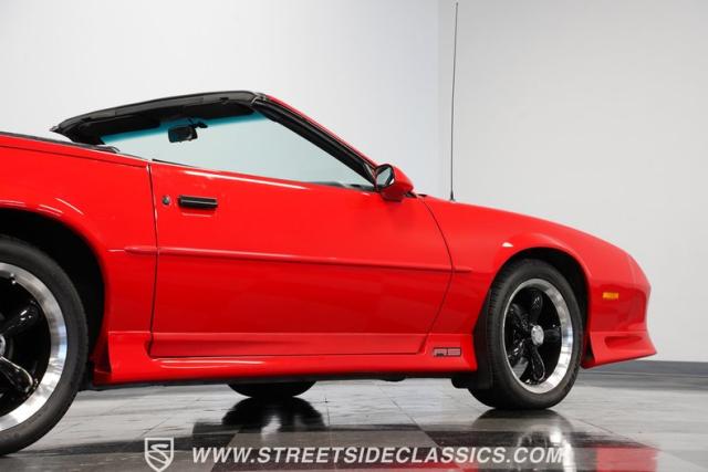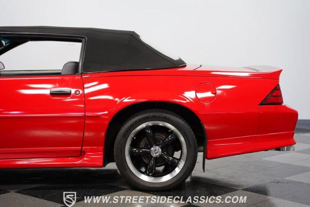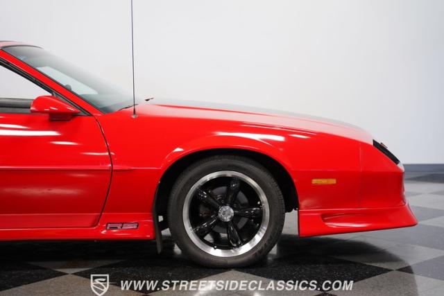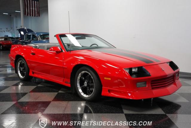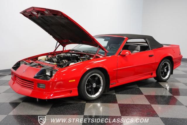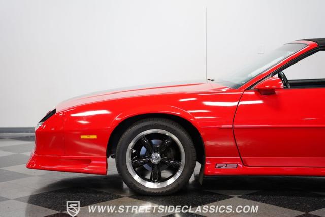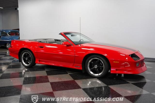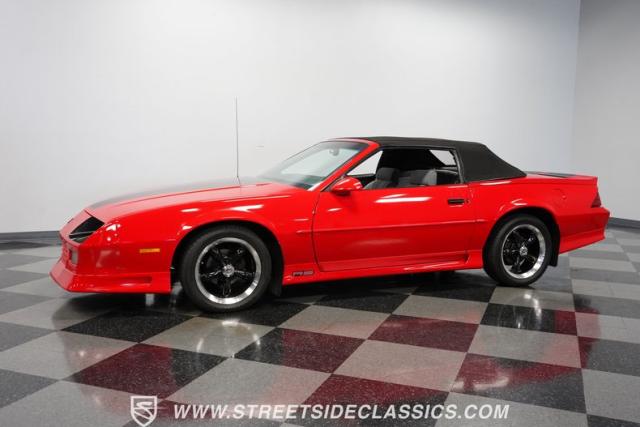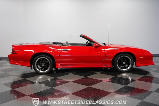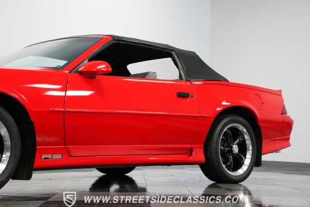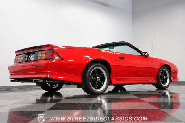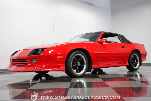 This 1992 Chevrolet Camaro RS 25th Anniversary Heritage Edition Convertible is a blast of American muscle, commemorating a quarter-century of Camaro excellence. Decked out in Bright Red paint, this drop-top stunner sports black decal stripes that accentuate its sleek profile. The RS badging proudly declares its heritage, while the black headlight buckets and body-colored grille set it apart from standard models. A manual black cloth convertible top adds versatility, allowing open-air cruising at a moment\'s notice. Rolling on 17-inch Vision wheels wrapped in Continental 235/45ZR17 tires, this Camaro perfectly balances classic style and modern performance. Chrome-tipped dual exhaust and mud flaps complete the exterior package, giving this anniversary edition an aggressive and refined look.