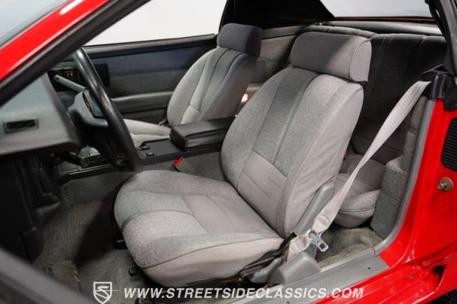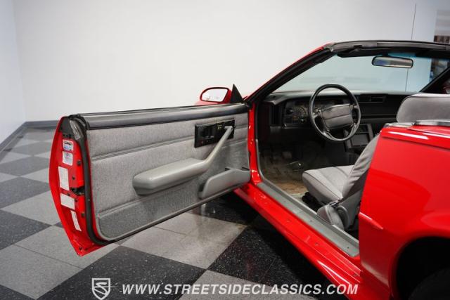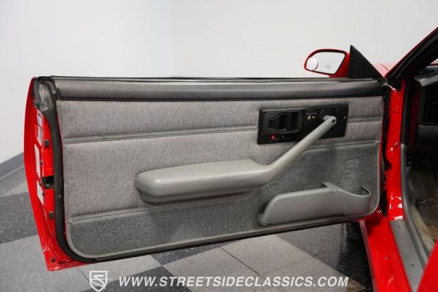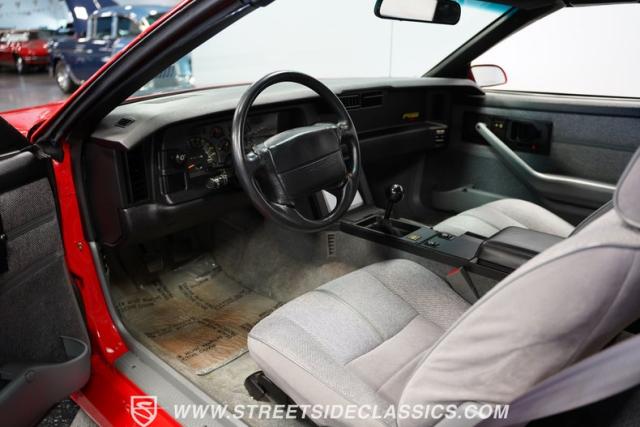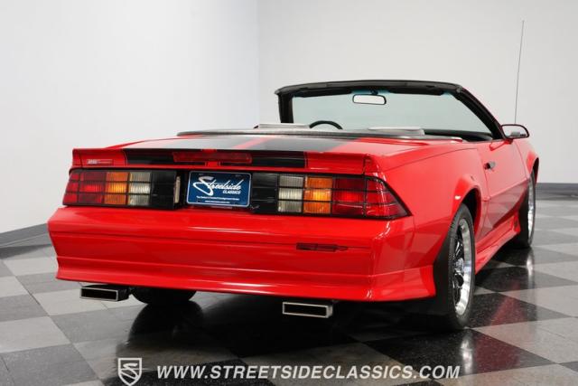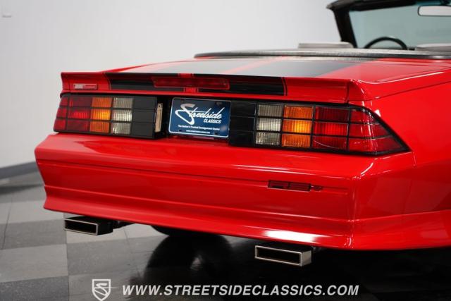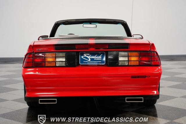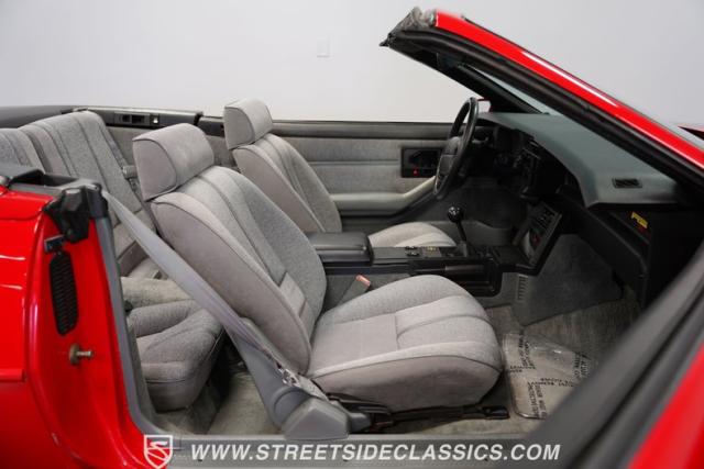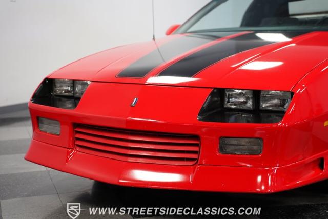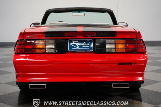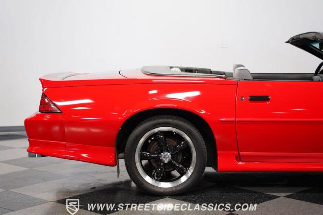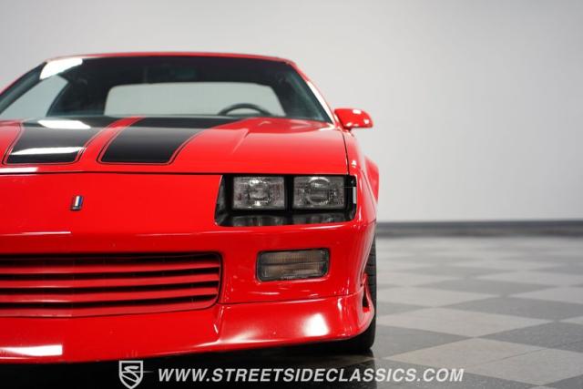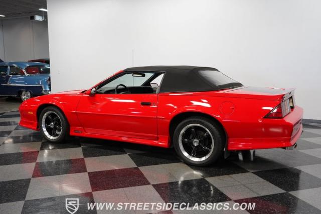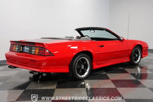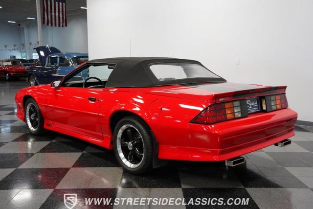 This 1992 Chevrolet Camaro RS 25th Anniversary Heritage Edition Convertible is a blast of American muscle, commemorating a quarter-century of Camaro excellence. Decked out in Bright Red paint, this drop-top stunner sports black decal stripes that accentuate its sleek profile. The RS badging proudly declares its heritage, while the black headlight buckets and body-colored grille set it apart from standard models. A manual black cloth convertible top adds versatility, allowing open-air cruising at a moment\'s notice. Rolling on 17-inch Vision wheels wrapped in Continental 235/45ZR17 tires, this Camaro perfectly balances classic style and modern performance. Chrome-tipped dual exhaust and mud flaps complete the exterior package, giving this anniversary edition an aggressive and refined look.