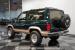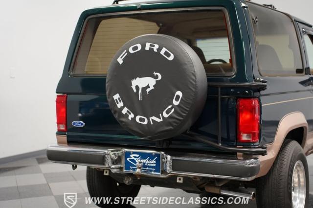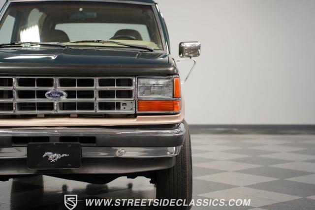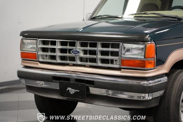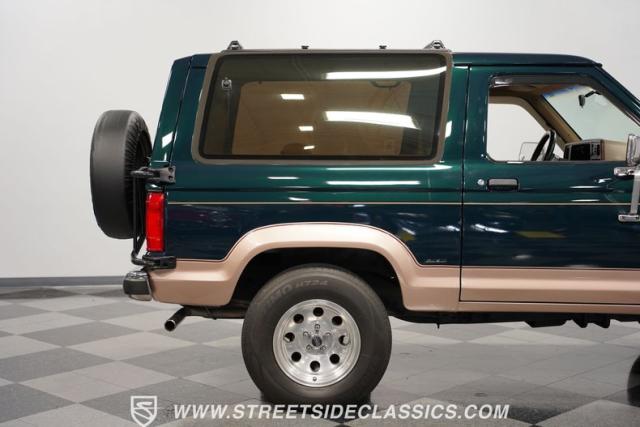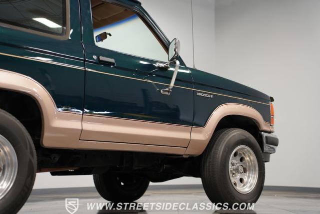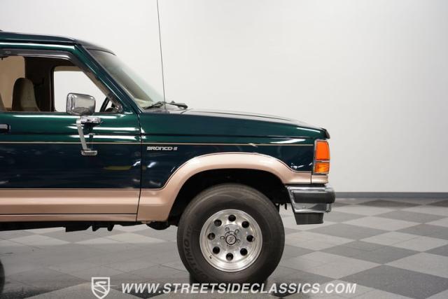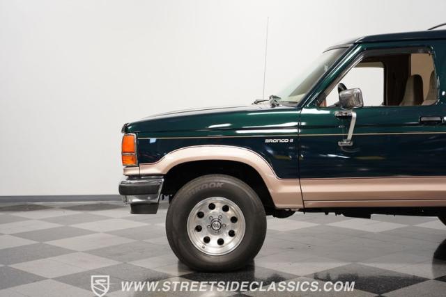 This 1989 Ford Bronco II Eddie Bauer 4x4 boasts a unique two-tone color scheme that sets it apart. The Hunter Green paint job, accented with gold stripes, creates a bold visual statement that\'s quintessentially late \'80s. Chrome American Racing wheels, wrapped in meaty 235/75R15 Hankook tires, give this compact SUV an aggressive stance. The Eddie Bauer badging adorns the body, signaling its premium trim level. A sturdy roof rack adds functionality, while the rear-mounted spare tire completes its rugged, adventure-ready look. The redesigned front fascia, featuring wraparound headlights and a bold grille, showcases the Bronco II\'s final evolution before the Explorer replaced it.