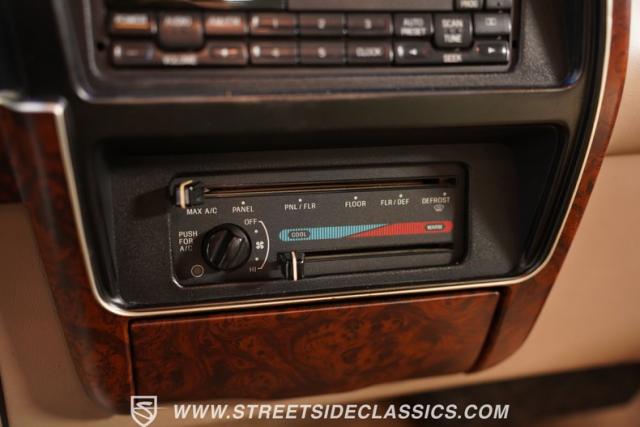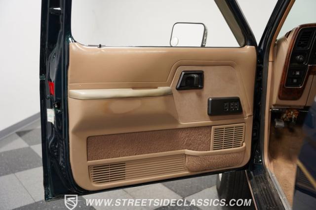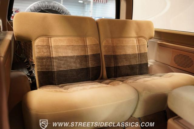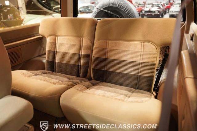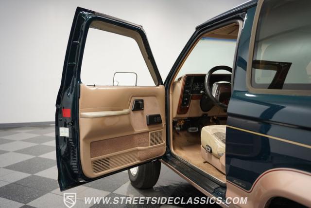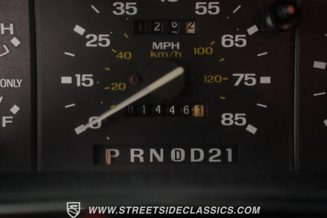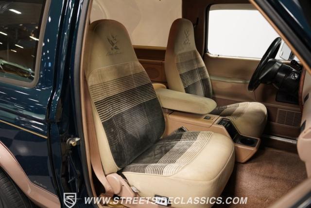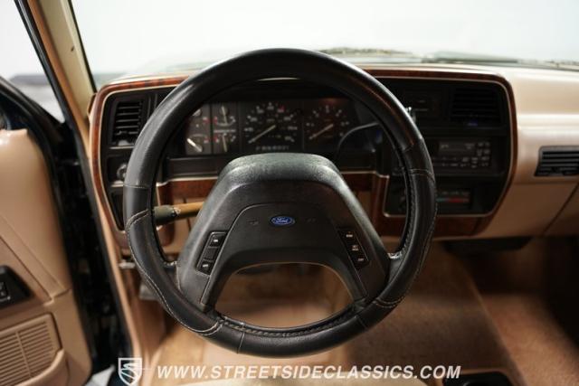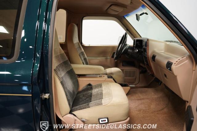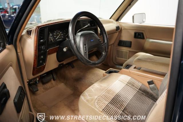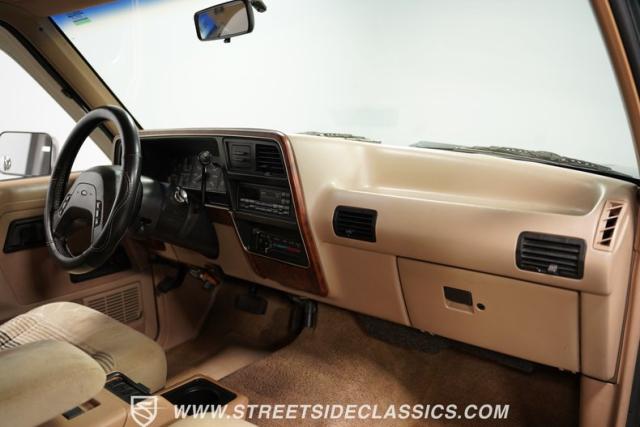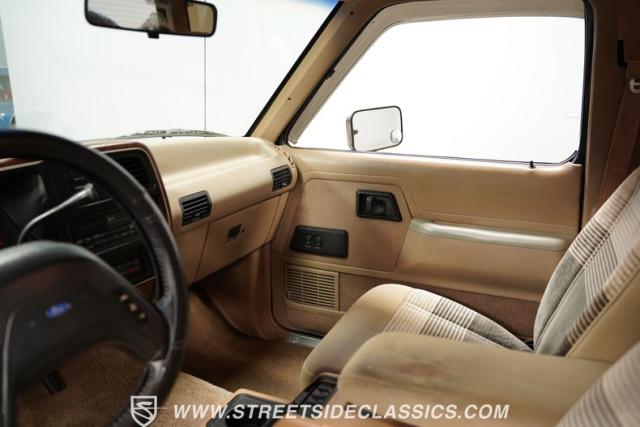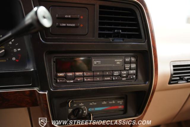 Light sandalwood cloth bucket seats define the Eddie Bauer edition\'s premium feel. The cabin maintains its factory layout, featuring air conditioning (upgraded to R134a), cruise control, and a tilt steering wheel for long-haul comfort. A factory cassette radio handles the tunes, while the center console offers practical storage. The electronic engaging four-wheel-drive system, controlled from within the cabin, readies this Bronco II for any terrain. The dash layout is straightforward and functional, with clear gauges and easy-to-reach controls. Carpeted floors and door panels in matching tones complete the cohesive interior design.