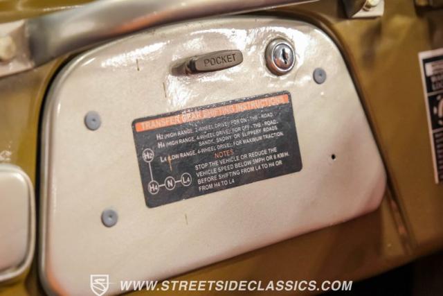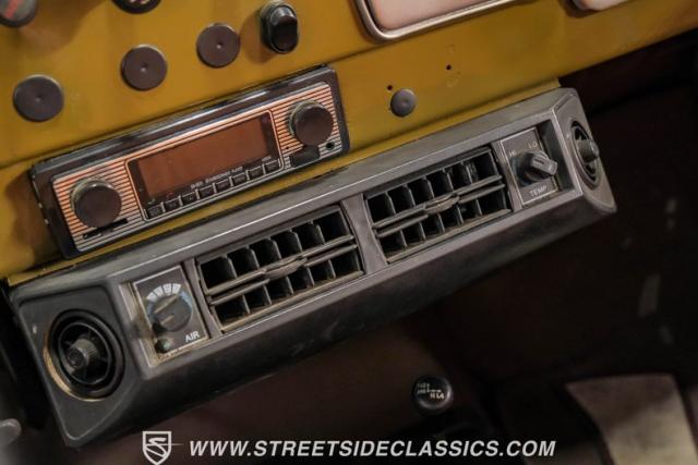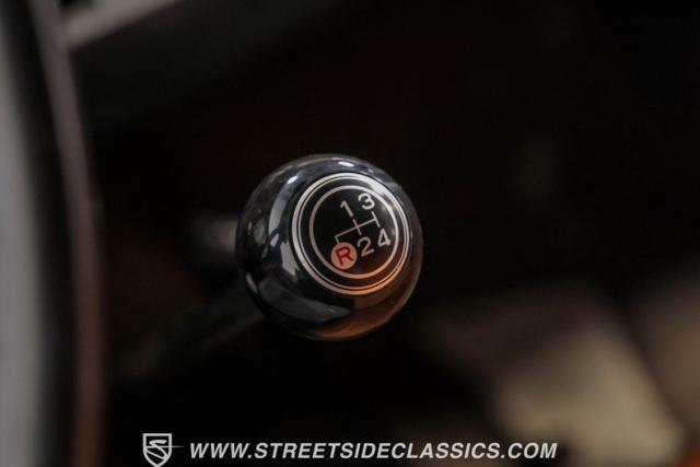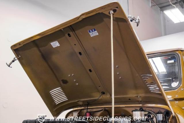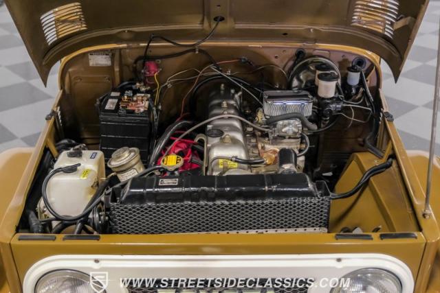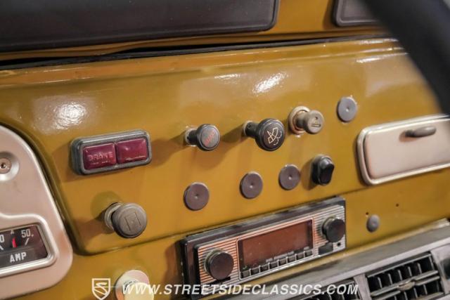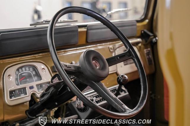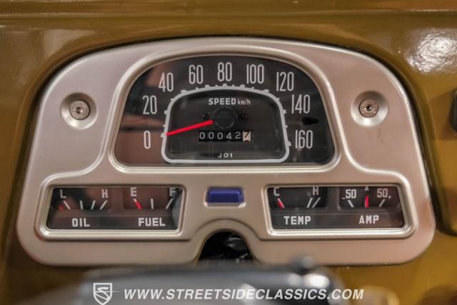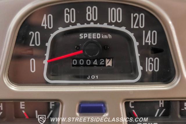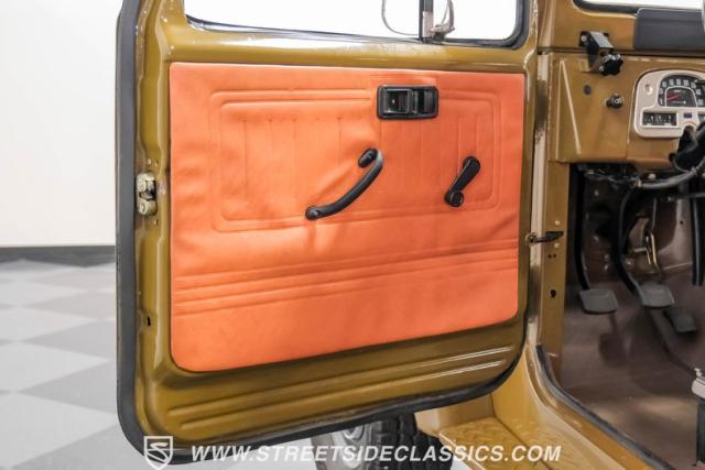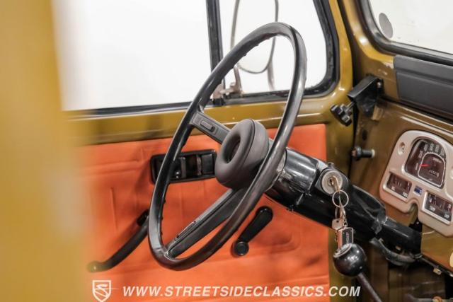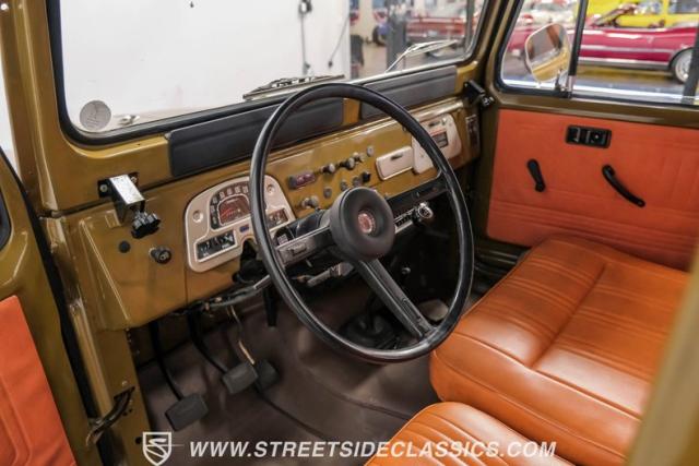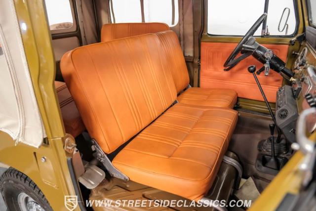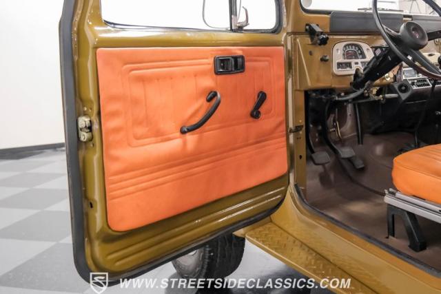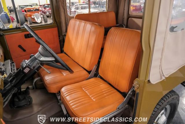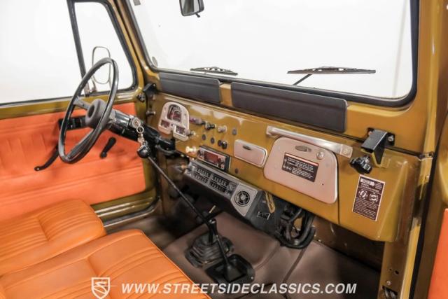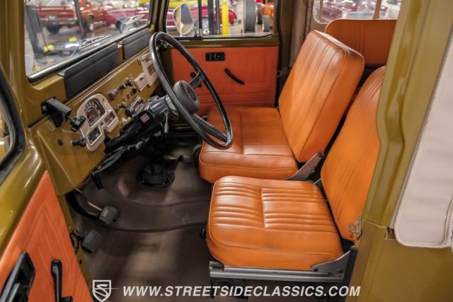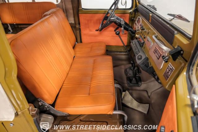 Open the door, and you\'re greeted by a bold Mandarin Orange vinyl interior that contrasts sharply with the exterior. The split-bench seat offers ample room for driver and passenger. A floor-mounted shifter for the 4-speed manual transmission sits within easy reach, ready for action. The straightforward dashboard layout keeps all controls at your fingertips, true to the FJ40\'s utilitarian design. Air conditioning ensures comfort on hot days, while the 5-digit odometer displays distance in kilometers, adding an international flair to this American-owned Japanese classic.
