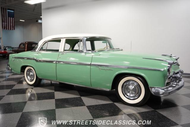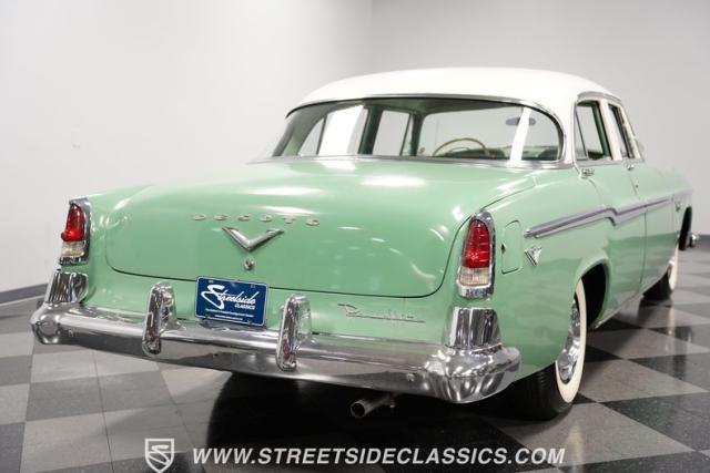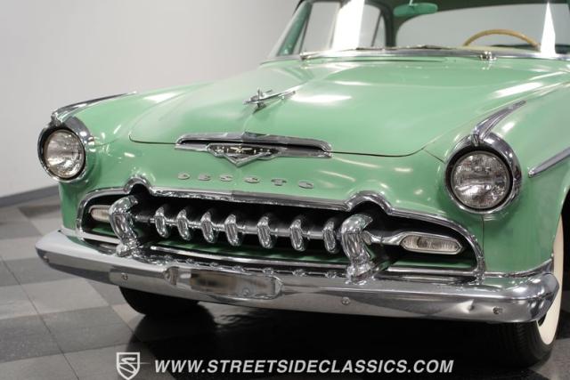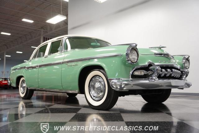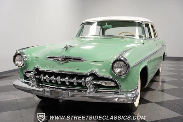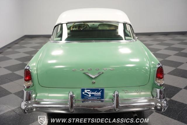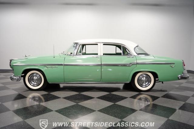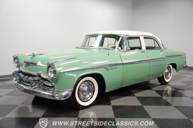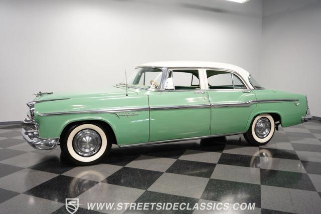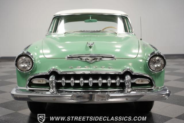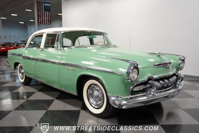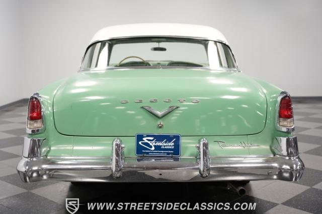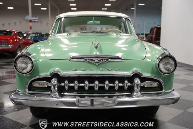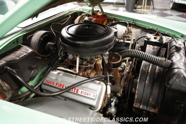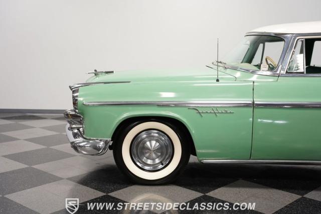 This is a car you don\'t see every day: a 1955 DeSoto Fireflite. Dressed in a sleek green with white that perfectly hugs its curves, this sedan is a prize on 15\" wheels and 7.6 - 15 tires. It\'s got that shine and those wide white wall tires with chrome hubcaps that scream class, making sure it doesn\'t just blend into the background.