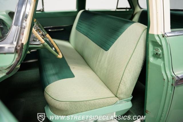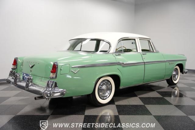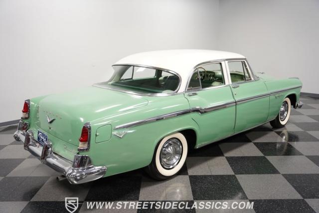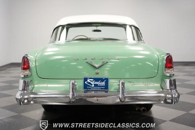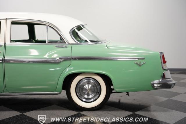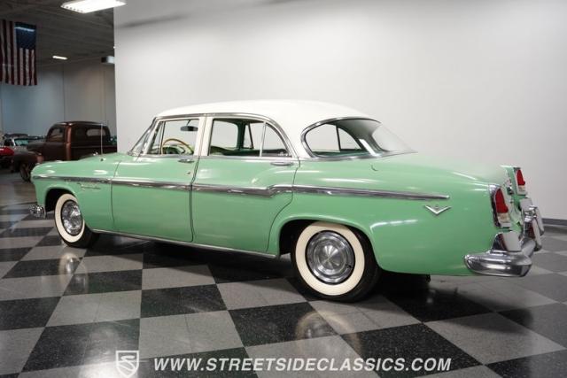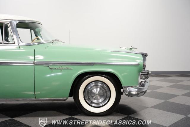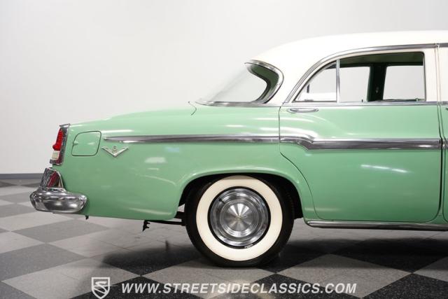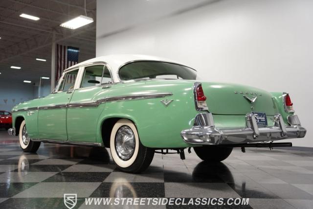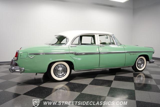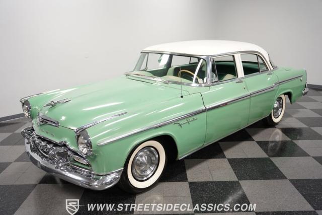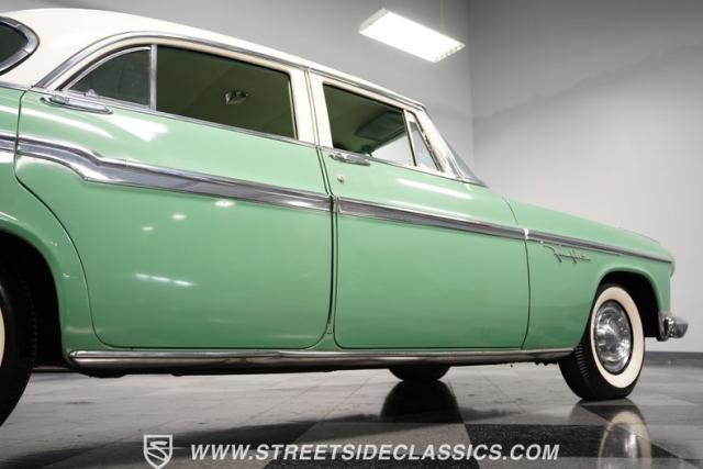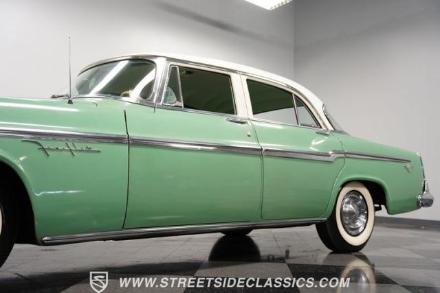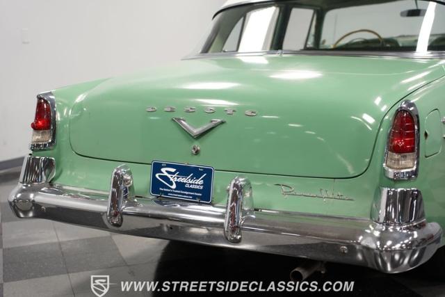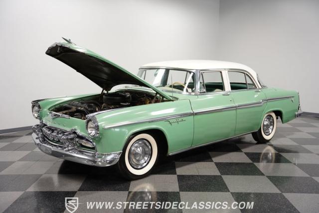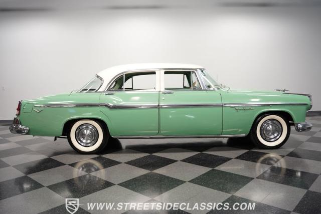 This is a car you don\'t see every day: a 1955 DeSoto Fireflite. Dressed in a sleek green with white that perfectly hugs its curves, this sedan is a prize on 15\" wheels and 7.6 - 15 tires. It\'s got that shine and those wide white wall tires with chrome hubcaps that scream class, making sure it doesn\'t just blend into the background.