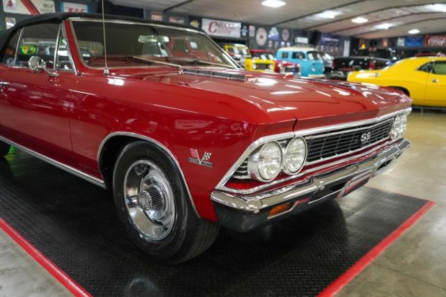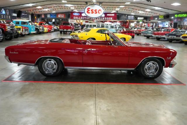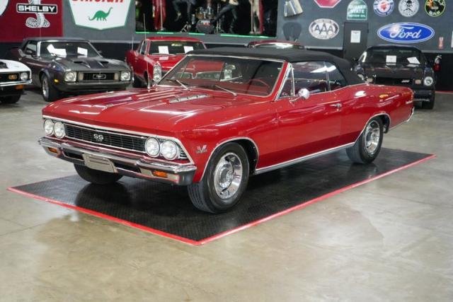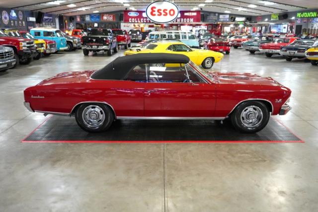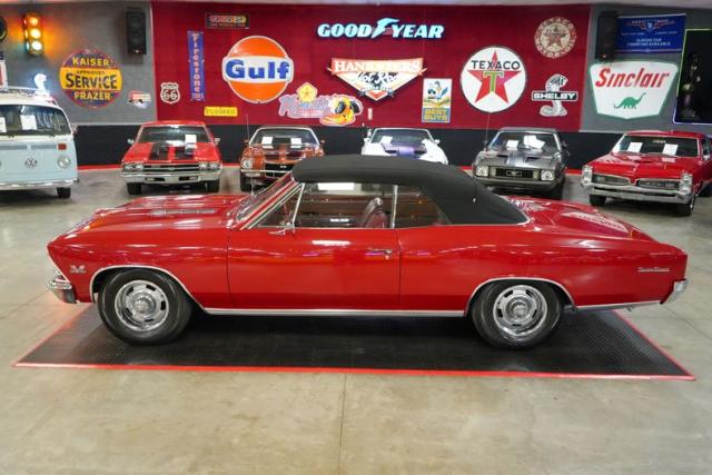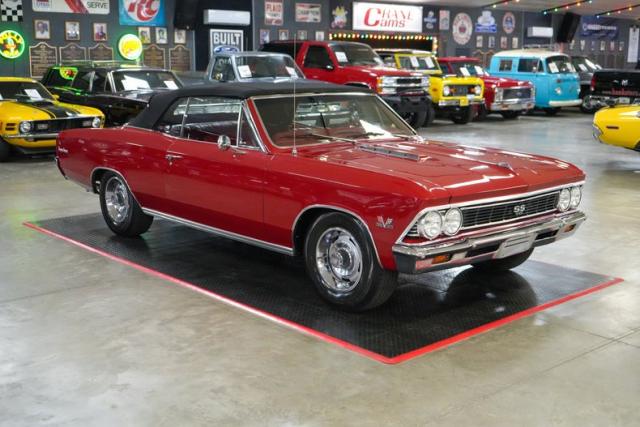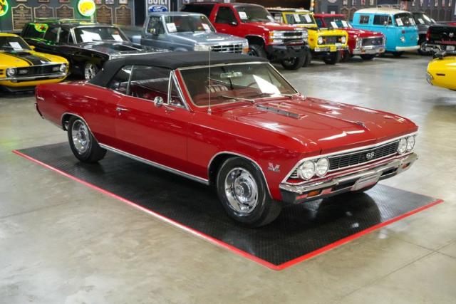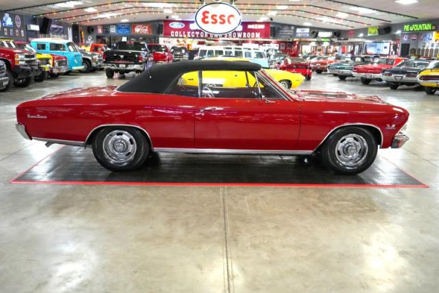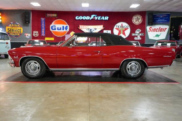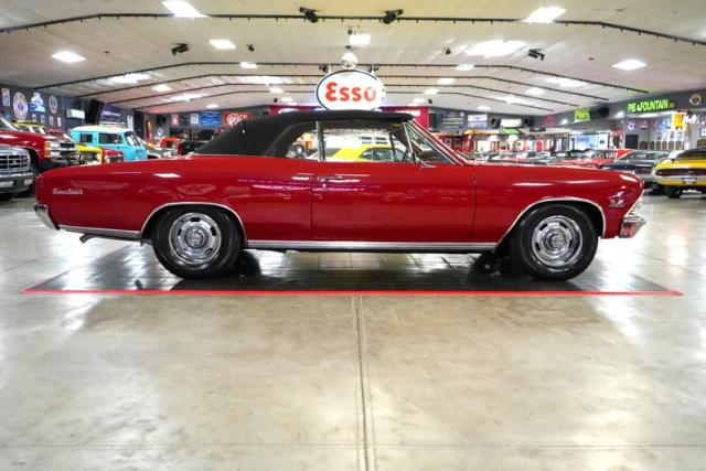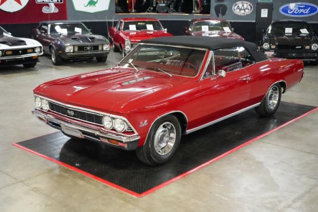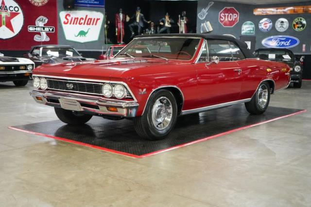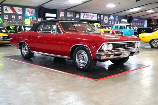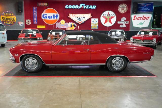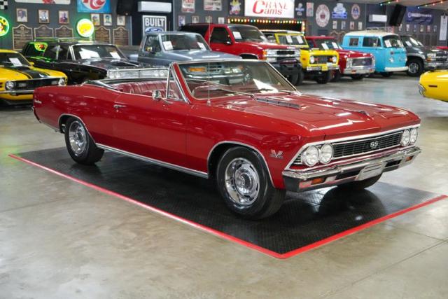 This 1966 Chevrolet Chevelle SS Convertible is a timeless muscle car powered by a 396 Big Block Chevy V8 paired with a Muncie 4-speed manual transmission for an engaging driving experience. A 3.31-geared rear end delivers smooth yet responsive performance. Finished in striking red with a black convertible top, it features a matching red vinyl interior for classic appeal. Equipped with power steering and power brakes, it offers comfortable cruising. Riding on OEM Rally wheels with Uniroyal tires, it retains its factory character with a Rochester 4-barrel carburetor and original-style components, making this Chevelle SS a true open-air muscle car icon. THIS VEHICLE QUALIFIES FOR FREE SHIPPING AND A WARRANTY!!