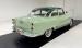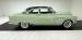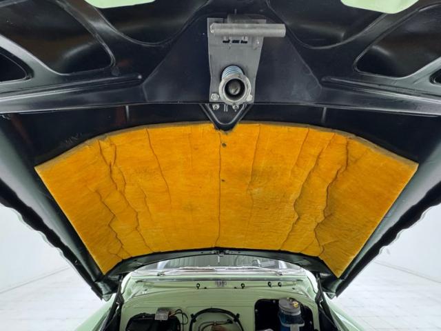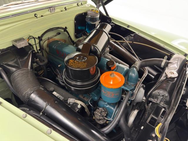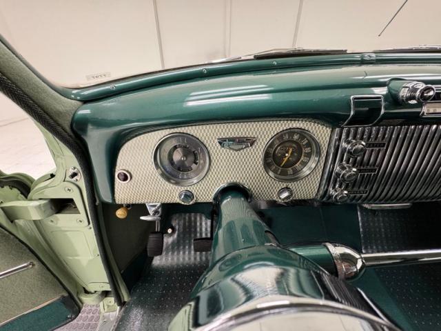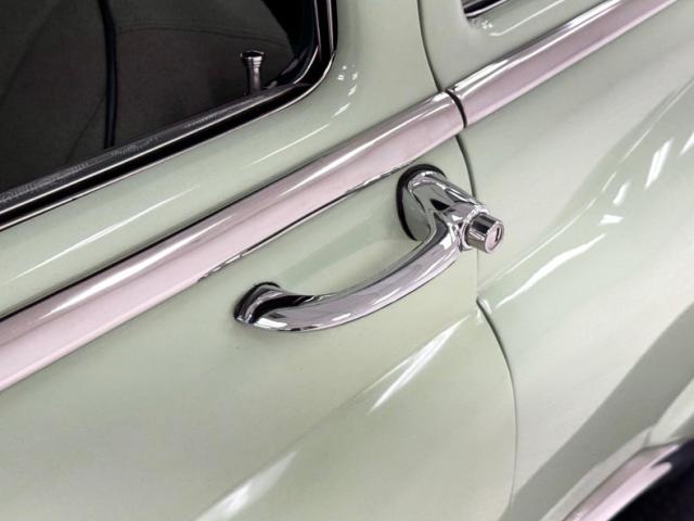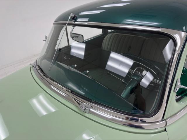 With its smiling toothy grille sporting more chrome than the Chicago bean sculpture, it\'s all dressed up in two tone Terrace Green over Ridge Green, the long roof beautifully accented in the darker of the two greens, and both in two stage sheen. The fenders sit below the bulbous hood and trunk and in front, run parallel to the machete shaped body trim that swings southward the polished rocker panel. But the highlight of the profile may just be the legendary fender ventiports. In back, the stacked double tail lights with a third small circle between them are endlessly simple and cool and cut right into the bodywork as opposed to being housed in an assembly. In front, the droopy eyed look of the headlights is made possible by the elongated bezel that collects the smaller marker light like a teardrop. The torpedo hood ornament is also sculpted into the hood\'s nose, not perched on top of it in a rather complex bit of artful engineering. 15-inch wheels with proper covers carry Coker white walls. The paint and metalwork are fantastic with one note of a paint run under a door as the only imperfection.