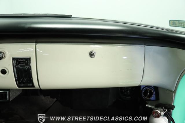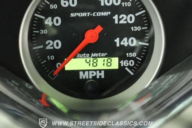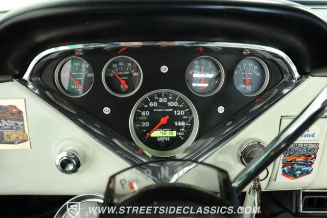 Inside, the cabin welcomes you with a well-maintained two-tone paint scheme and deep black vinyl bench seating that combines comfort with classic styling. The dashboard features AutoMeter Sport-Comp gauges and vintage air controls, complemented by an aftermarket tilt steering wheel and moon tachometer for a touch of modern convenience. Rubber floor covering and minimal chrome accents complete the interior, offering a blend of simplicity and function that stays true to the truck\'s heritage.