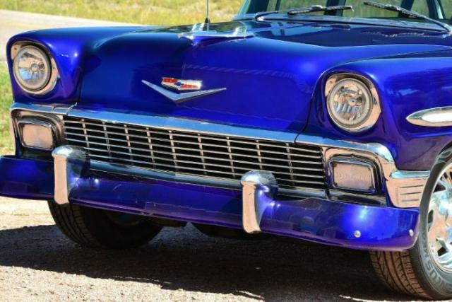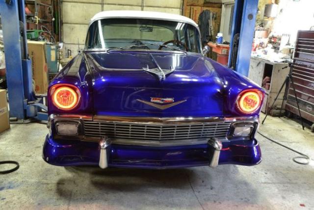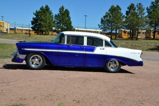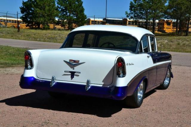 Beautiful 1956 Chevrolet Belair 4 door, draped with a Kandy Burple and white shell cleared with House of Kolors crystal clear coat. full restore with upgrades and new tech. Lets start with it has a 283 out of a 1960 C1 Corvette, upgraded with edelbrock 600 cfm carb. and converted to Hei to make it more reliable. there really is way to much to list Next :This is the nicest driving Chevy I have driven! This car has numerous options such as Power Brakes, 4 wheel disc brakes,retro radio(usb,aux,ect.) with 56 look. new gauges, rear air shocks, new glass and so more The car did receive a restoration that was completely taken apart and built into what it is today. Has an awesome look with custom work done all the way around! Every bit of this car was paid special attention to make sure this was show ready. all the lights have been updated to LED\'s, All new tinted glass, new rubber everything, 4 wheel disk conversion with new booster retained e-brake. new daytona carpet, new upholstery in a black and white hounds tooth with white vinyl(more durable with easy clean up), trunk kit with custom chevy emblem sewn in, brand new 6x9\' speakers with powered 10\' sub between rear seat and trunk kit so non of the speakers are visible. custom rear trunk lid with chevy emblem sewn in to match. new door panels, steering wheel, gauges, and again so much more.... Our objective with this car was to make a brand new 56\'. every piece of stainless steel(chrome) was harvested from junk yards finding all the best pieces from over 30 cars. you can tell the difference from the original stainless steel body trim compared to new reproduction chrome. unfortunately there was 3 pieces that could not be found in good enough condition. if your a bel air enthusiast you already know. but a hood bar, and the fender extensions.There is a ton of money in this car and was only purchased as the best of the best from Eckler\'s and Danchuk. The color blue is not a good description as the Kandy Burple.