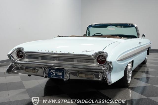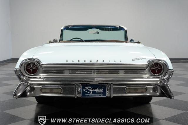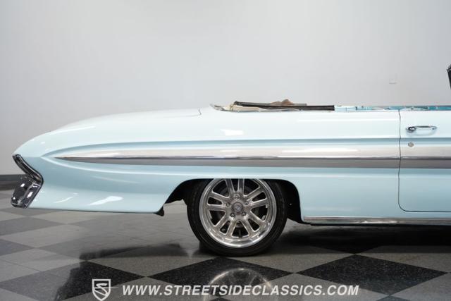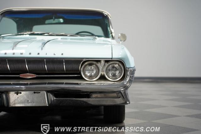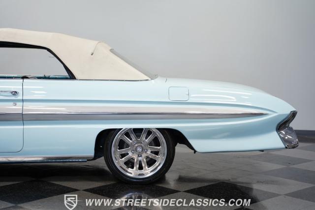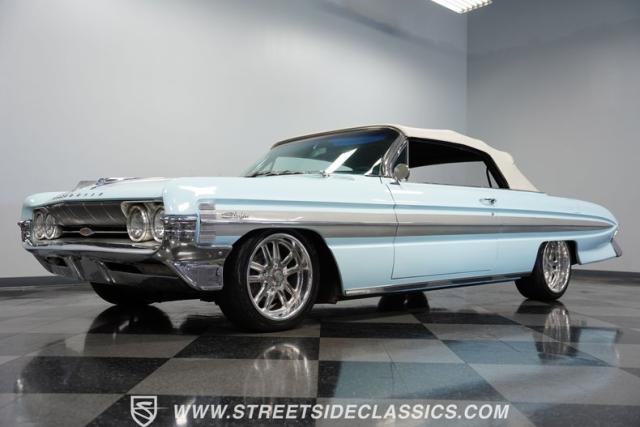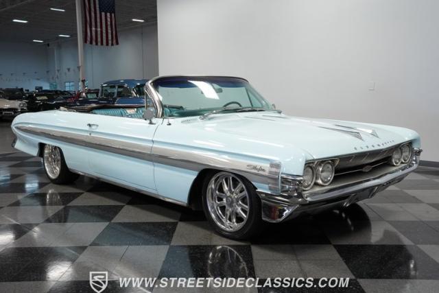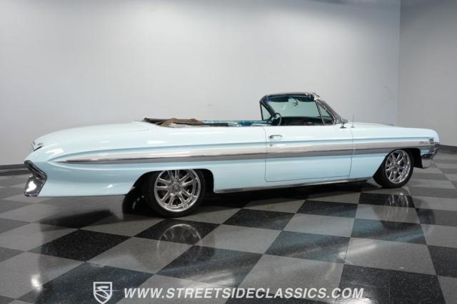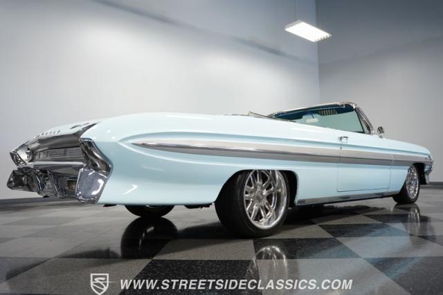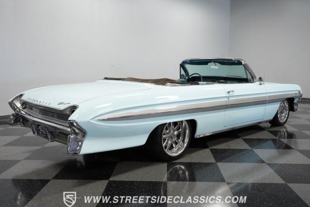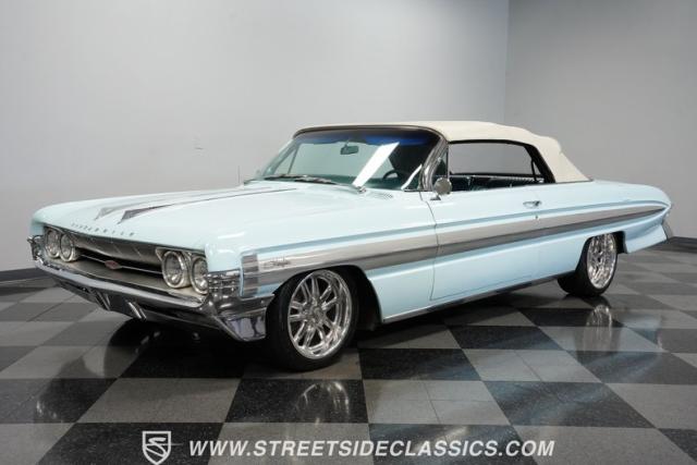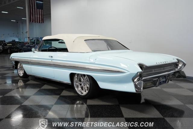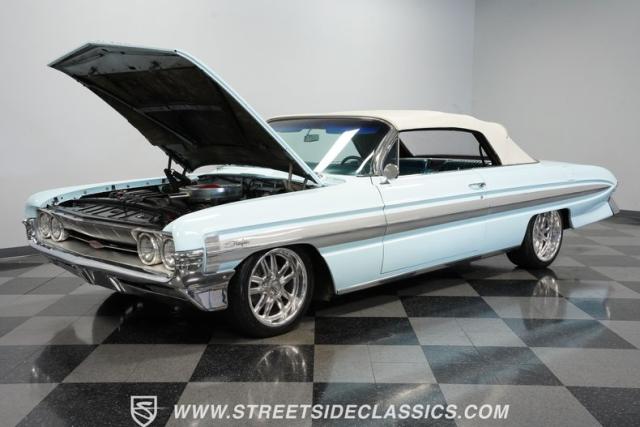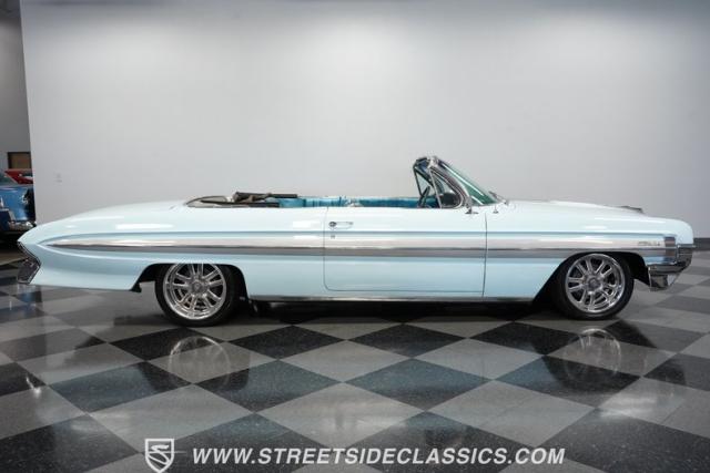 This 1961 Oldsmobile Starfire Convertible, one of only 7,800 produced, cost more than a Corvette when new. Its Glacier Blue paint sparkles under the sun, complemented by distinctive silver side streaks inspired by its namesake, the Lockheed F-94 Starfire jet. The white vinyl convertible top adds a sharp contrast to the sleek bodywork. Modern 17-inch front and 18-inch rear US Mag wheels give this classic a contemporary edge, wrapped in 205/50R17 front and 255/40R18 rear tires. The lowered stance, achieved through a spring drop, amplifies its road presence. Chrome bumpers and trim pieces shine brilliantly, showcasing the car\'s premium status.