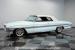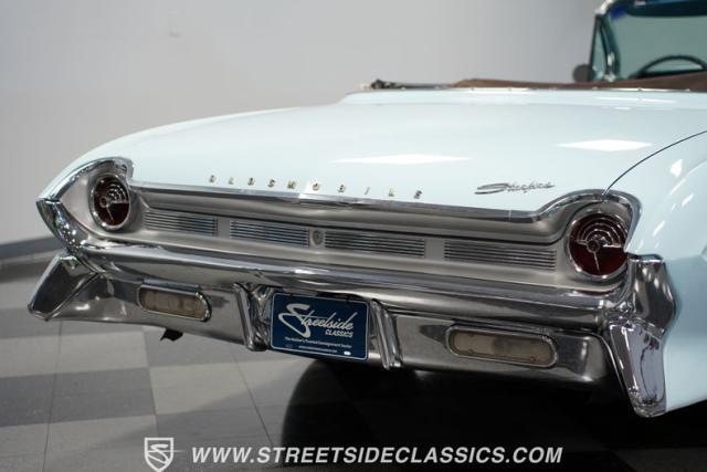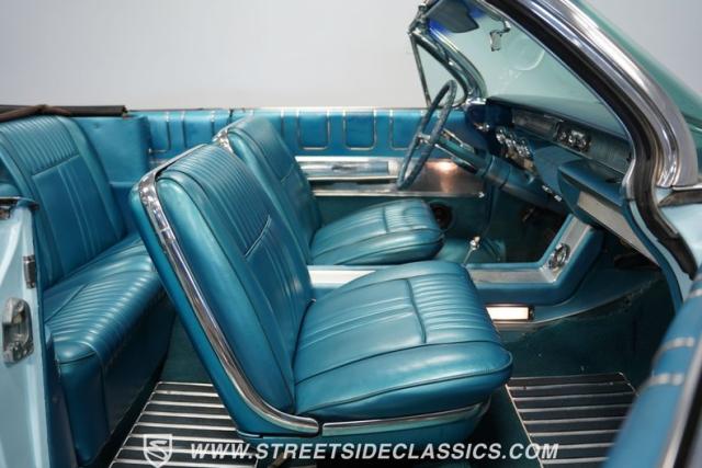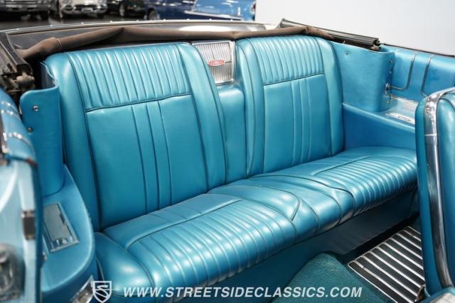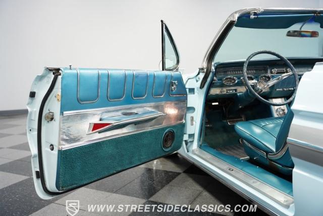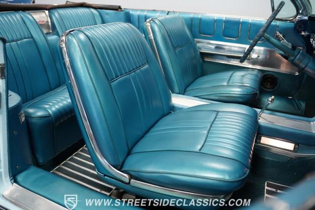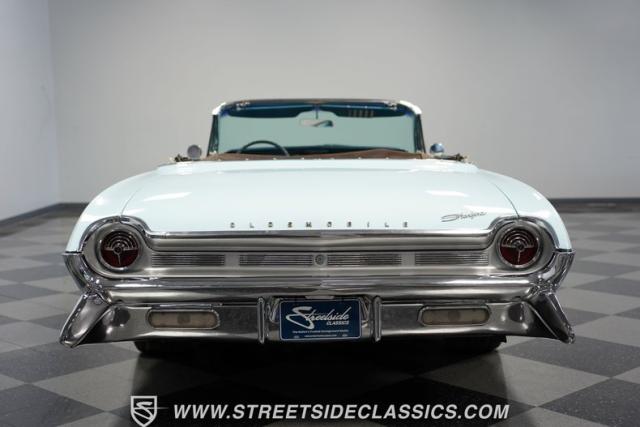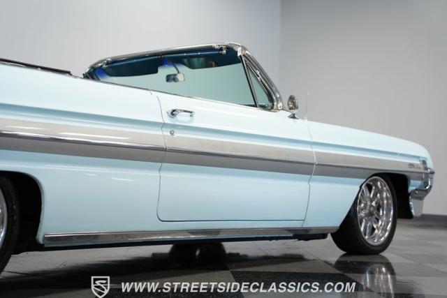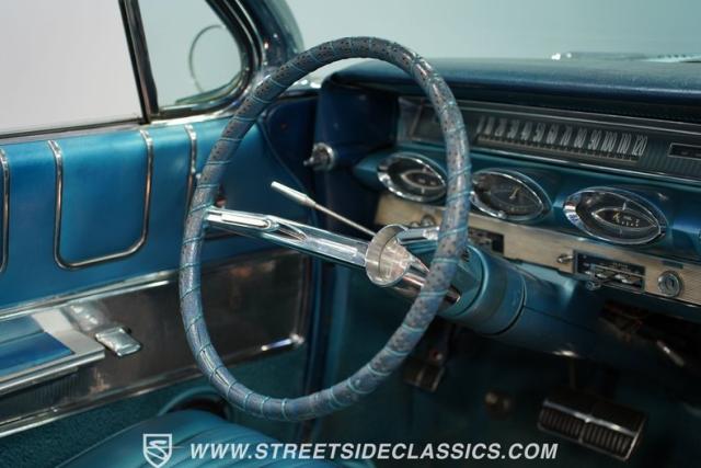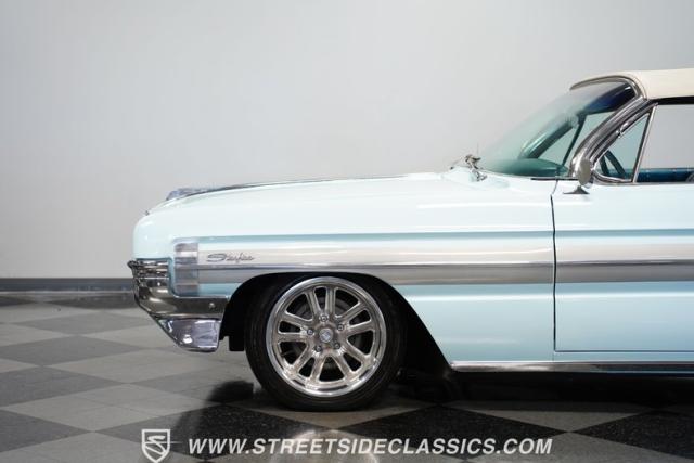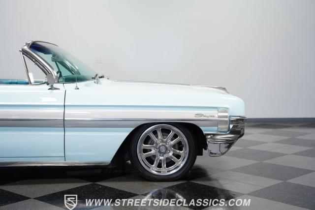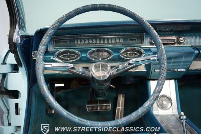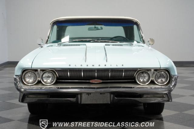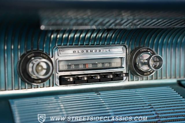 This 1961 Oldsmobile Starfire Convertible, one of only 7,800 produced, cost more than a Corvette when new. Its Glacier Blue paint sparkles under the sun, complemented by distinctive silver side streaks inspired by its namesake, the Lockheed F-94 Starfire jet. The white vinyl convertible top adds a sharp contrast to the sleek bodywork. Modern 17-inch front and 18-inch rear US Mag wheels give this classic a contemporary edge, wrapped in 205/50R17 front and 255/40R18 rear tires. The lowered stance, achieved through a spring drop, amplifies its road presence. Chrome bumpers and trim pieces shine brilliantly, showcasing the car\'s premium status.
