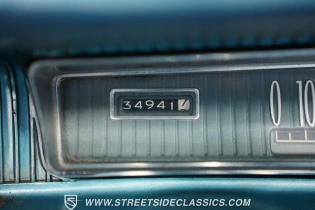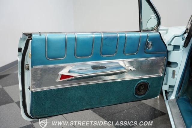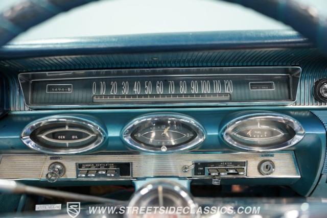 Inside, blue vinyl bucket seats greet the driver and passenger, a forward-thinking feature for 1961. The floor-mounted shifter and center console were revolutionary for their time, setting a trend for future performance cars. Power windows add convenience, while the original AM radio brings back memories of the rock \'n\' roll era. Chrome accents adorn the dash, presenting essential gauges and controls in a clear, driver-oriented layout.