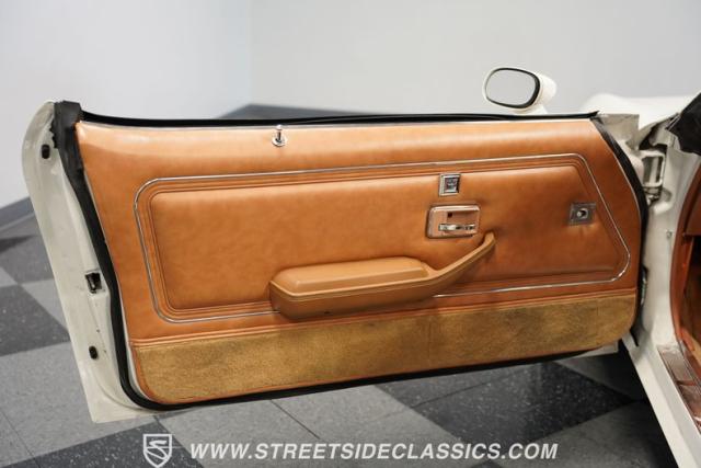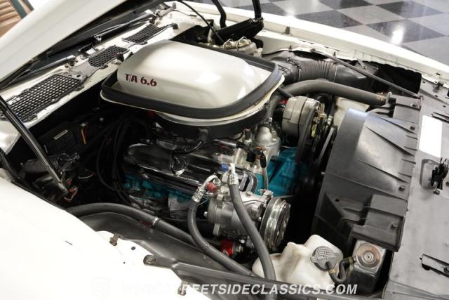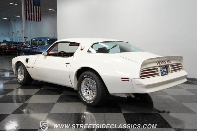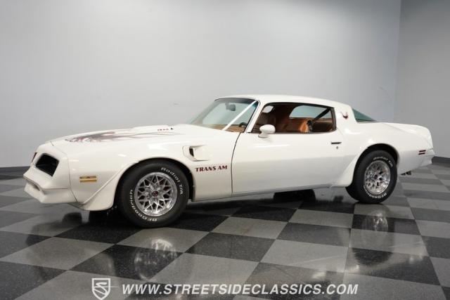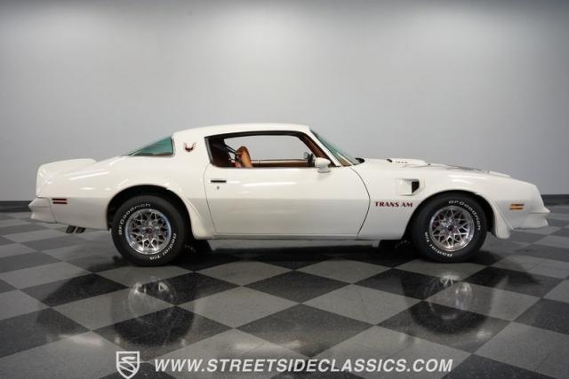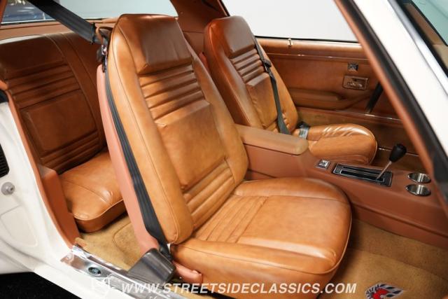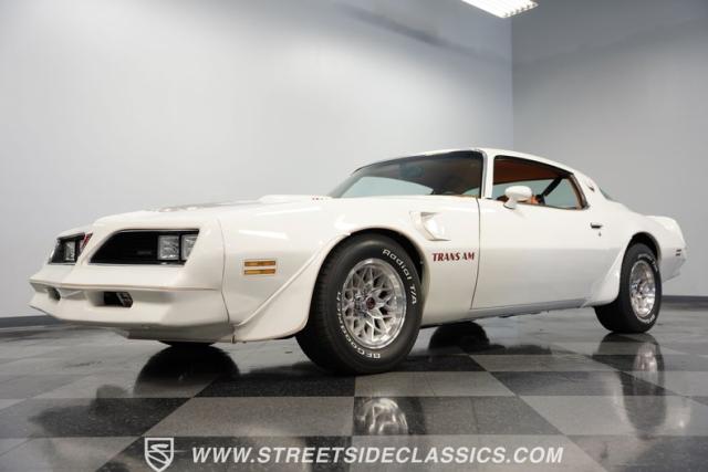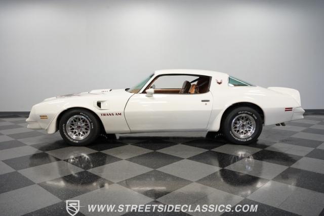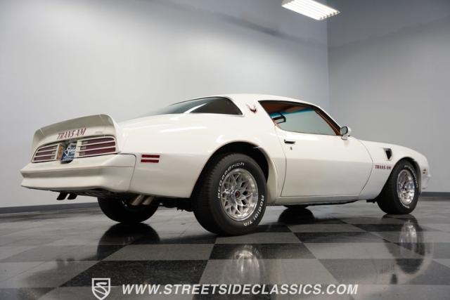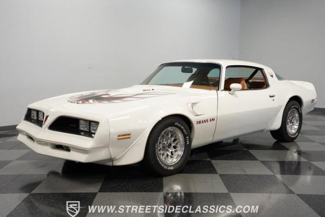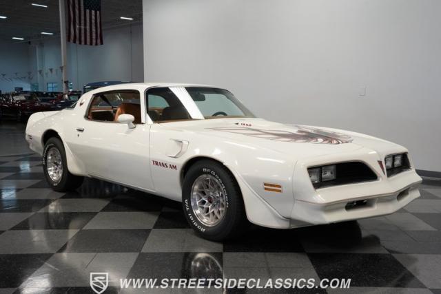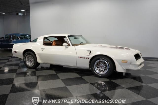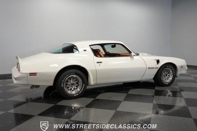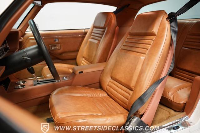 This 1977 Pontiac Firebird Trans Am, fresh from a February 2023 restoration, cuts an impressive figure in its glossy white paint. New Phoenix graphics decals adorn the body, paying homage to its muscle car lineage. The iconic Trans Am sits proudly on 15x8 snowflake wheels, wrapped in meaty 255/60R15 tires that fill out the wheel wells. Fresh wheel flares accentuate its aggressive stance, while a new windshield provides crystal-clear visibility. The smooth, even coverage of the PPG base coat and clear coat paint gives this Firebird a mirror-like finish that reflects its status as a true American classic.